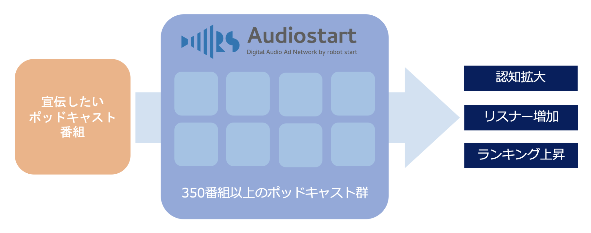 今回のパッケージでは、ロボットスタートが運営する、350以上のポッドキャスト番組を束ねた日本最大級のポッドキャストアドネットワーク「Audiostart」を活用いただけます。他のポッドキャスト番組を聞く最大100万UUに認知を促すことで、認知拡大とリスナー獲得につなげます。
