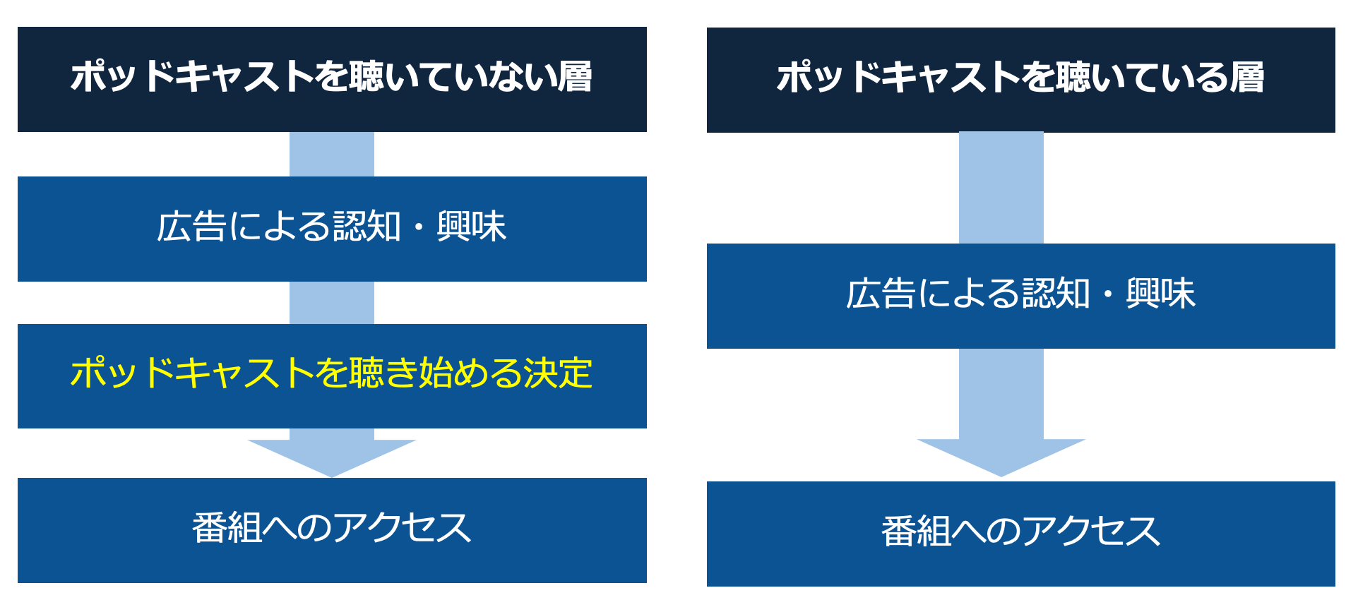 ポッドキャスト広告市場が3,000億円を超える米国では「ポッドキャスト番組の最も効果的なプロモーション手段はポッドキャスト広告」とされています(Westwood One調査より)。「ポッドキャストを聴いていない層」よりも「ポッドキャストを既に聴いている層」の方がアクションを取るためのハードルが低く、高い広告効果が期待できるためです。