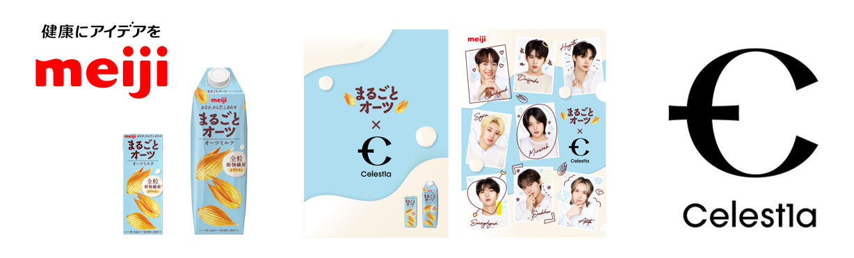 今回のプロモーションは2024年4月15日から開始し、関東エリアの流通店舗にて「明治まるごとオーツ オーツミルク 200ml」を3点、「明治まるごとオーツ オーツミルク 1000ml」を1点以上購入した方に、Celest1aコラボデザインのクリアファイルを1点プレゼントいたします。賞品は数量限定ですので、是非お近くの流通店舗にてお買い求めください。