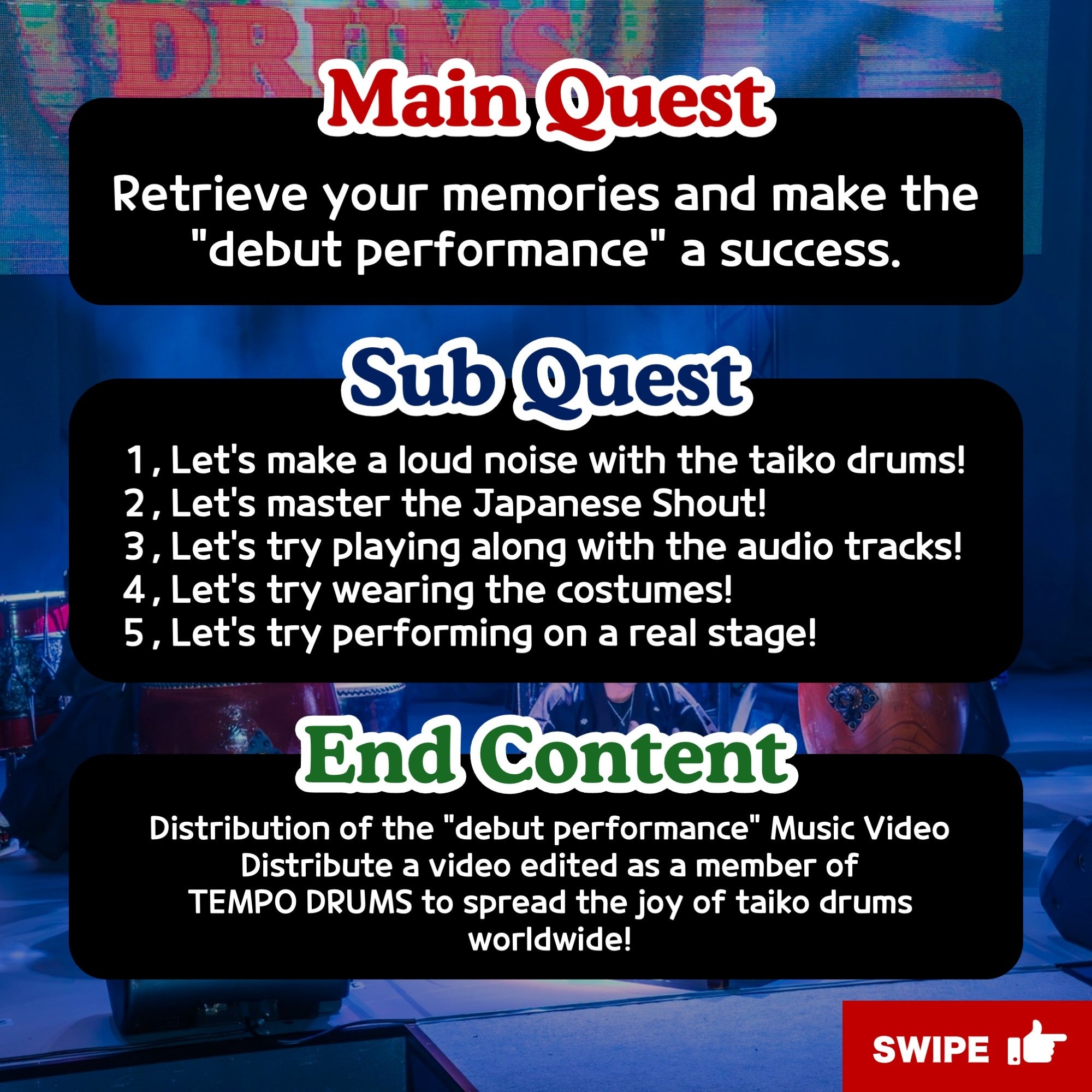 成为了憧憬已久的和太鼓表演团体『TEMPO DRUMS(テンポ ドラムス)』的成员,今天是期待已久的首次舞台演出。并且还将进行全球直播! 然而…一到剧场,却突然失去了关于『TEMPO DRUMS』的所有记忆! 不知如何敲击太鼓,不知如何穿着服装,甚至不知道演奏曲目……那么,能够成功完成首次舞台演出吗!?