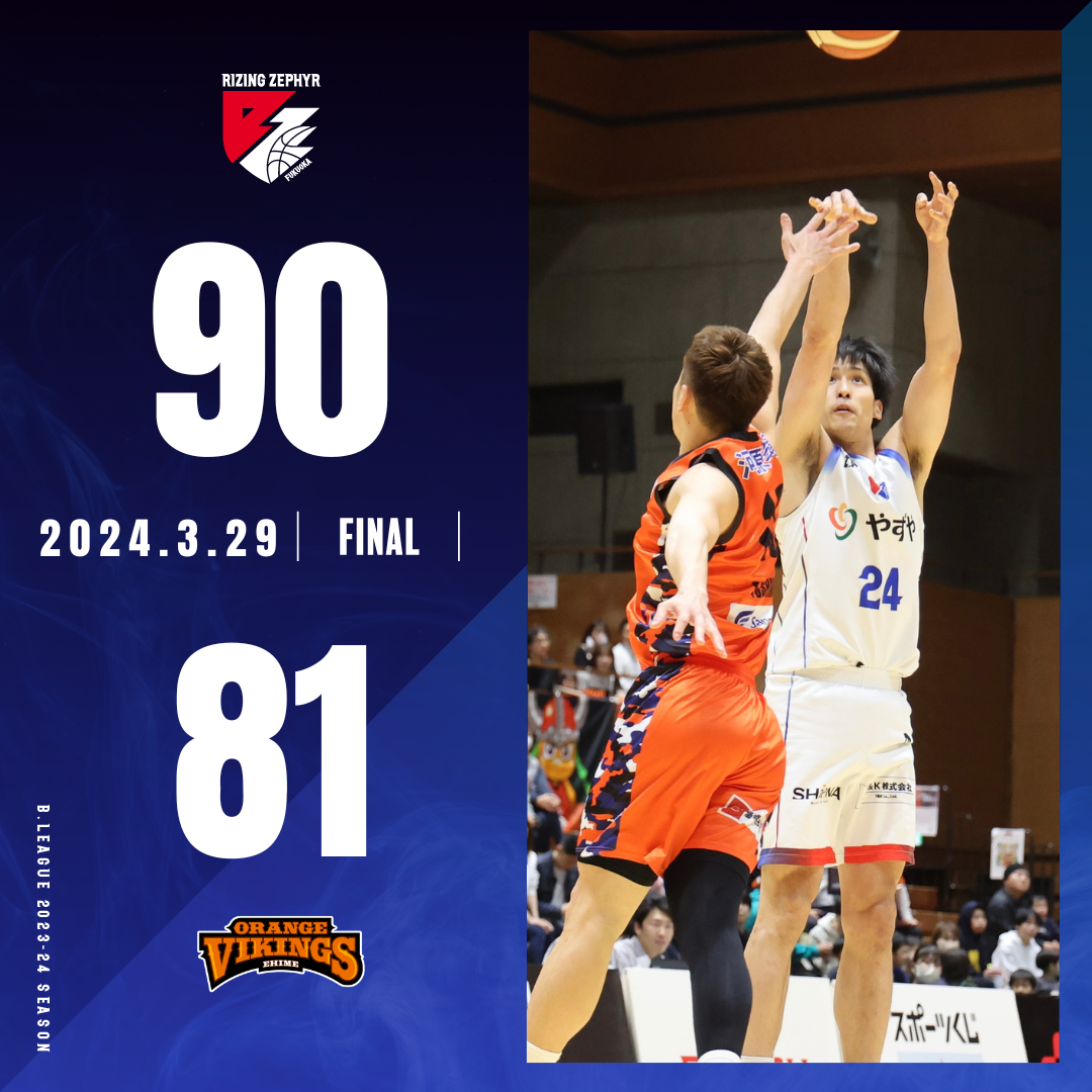 2024年3月29日(金)に開催されました【ライジングゼファーフクオカvs.愛媛オレンジバイキングス】において“福岡90-81愛媛”の結果となりましたことお知らせいたします。