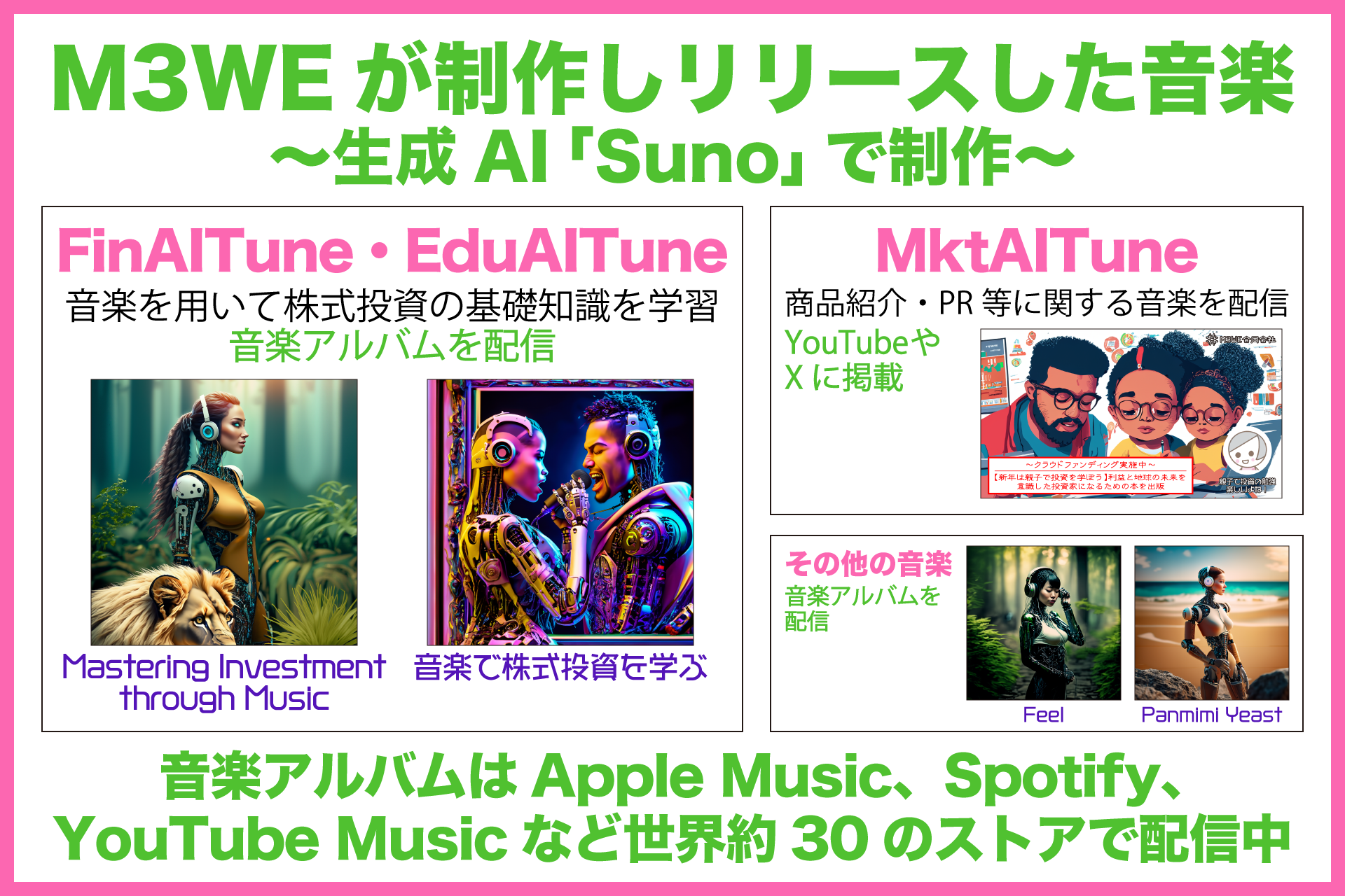 2023年12月より弊社では「FInAITune、MktAITune、EduAITune」の取り組みを開始しています。弊社では、音楽生成AI Sunoを活用し、音楽を用いて株式投資の基礎知識を学ぶための曲作りをし、音楽アルバムとしてリリース(日本語版・英語版)しました。他にも、商品のPRに音楽を作成し、YouTubeやX等で配信しました。