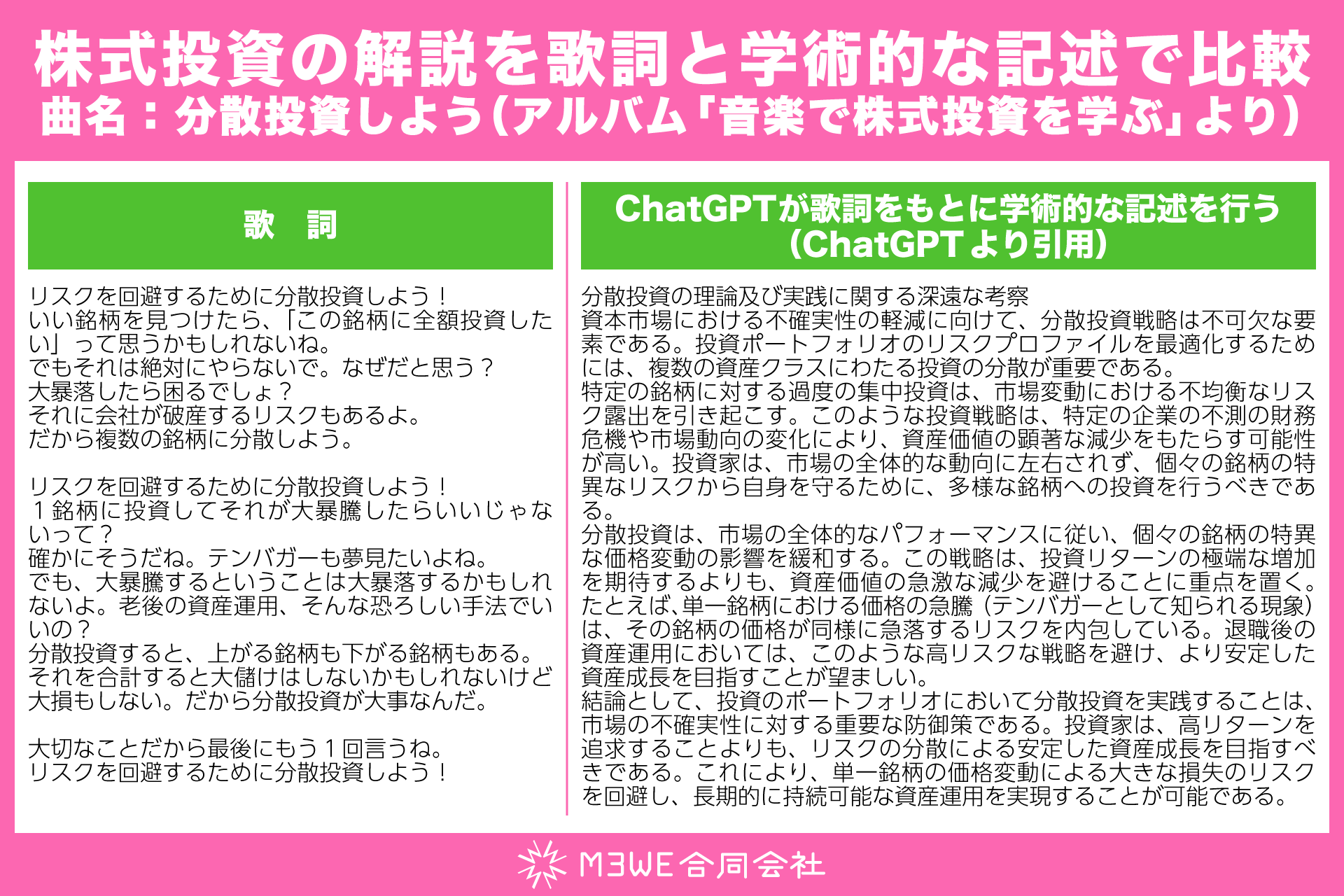 音楽を活用すると、難解な概念をシンプルに伝えることができます。例えば、株式投資の「分散投資」を理論的に解説すると複雑ですが、歌詞にすると直感的に理解しやすいものになります。これにより容易に投資に対して理解を深めることができます。