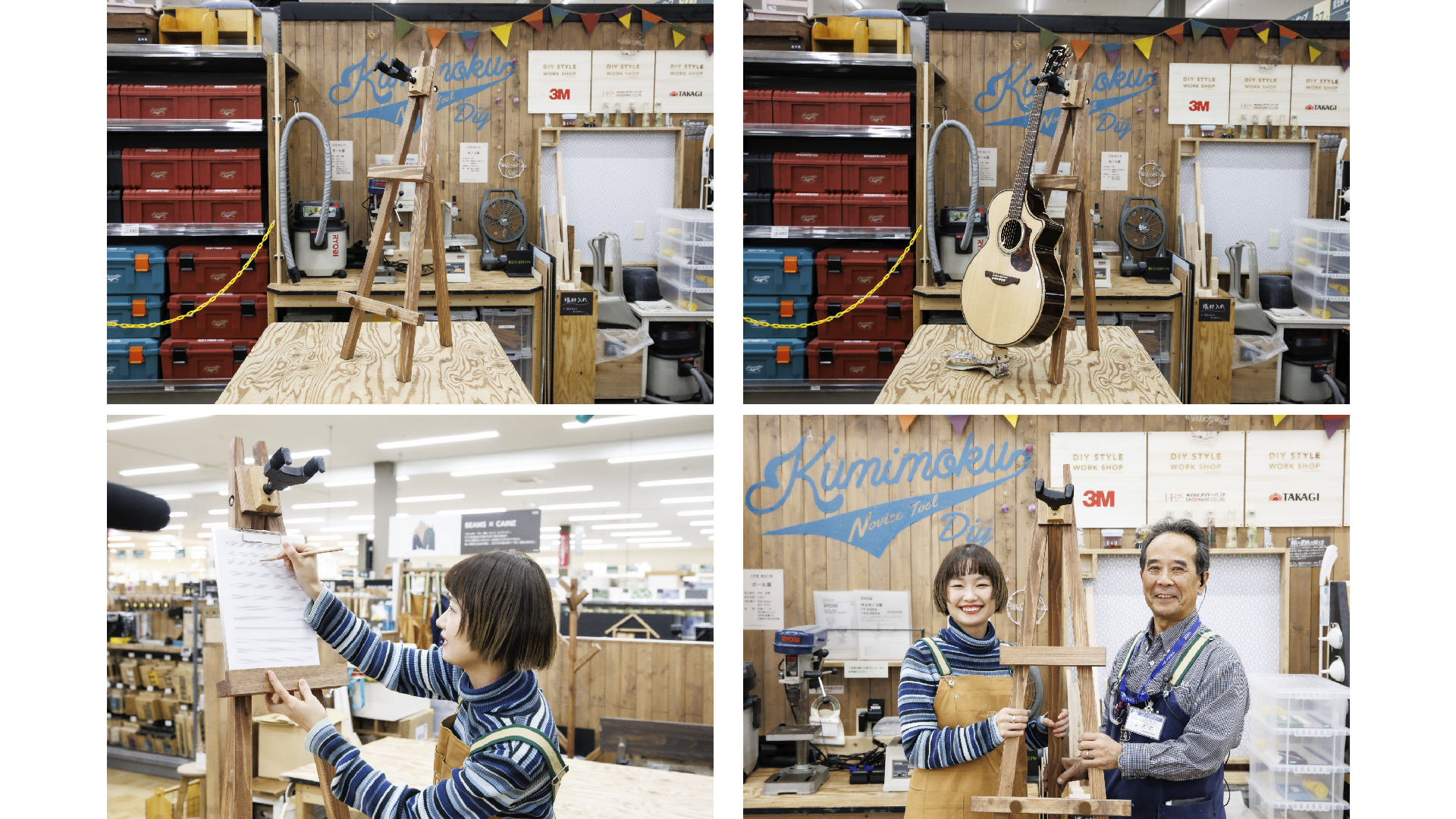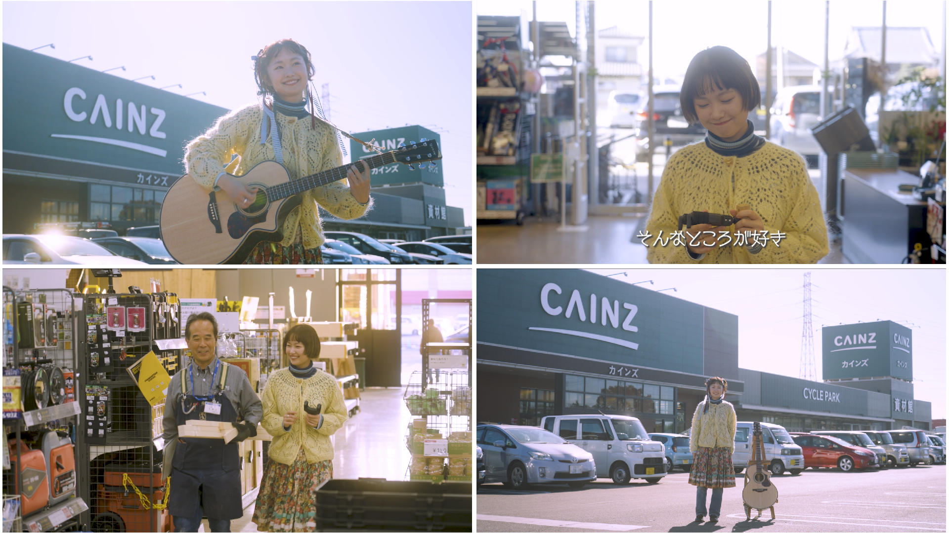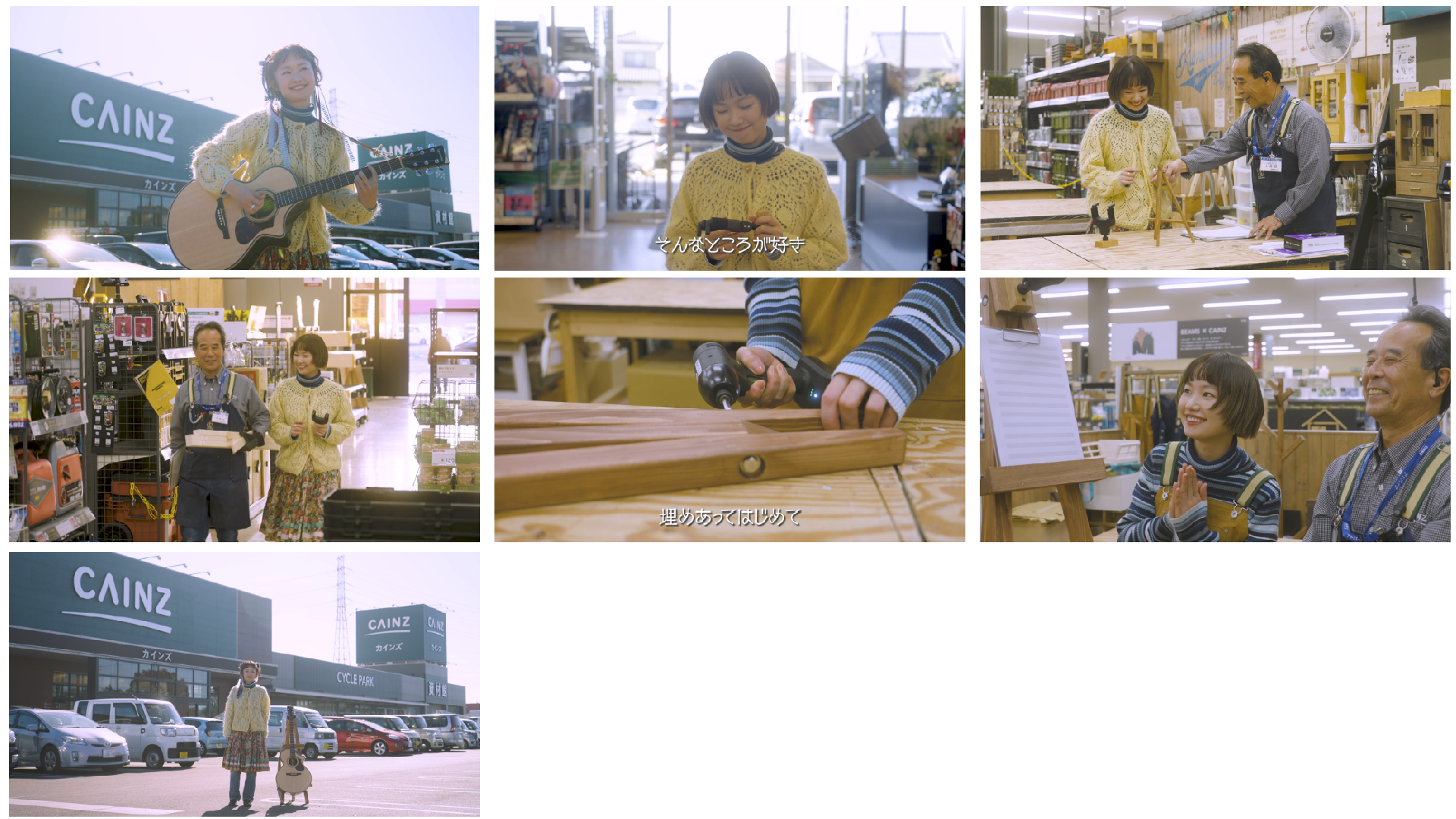 自分だけのオリジナルギタースタンドを夢見る女性を題材にしたショートストーリー。壁掛け用ギターハンガーを手にしたお客様がカインズを訪れ、DIY専門のメンバー(従業員)に相談。設計や材料選び、木材の加工を経て、イーゼル型ギタースタンドが完成に至るまでをドラマ仕立てにしながら、演奏シーンを交えたミュージックビデオ作品に仕上げました。