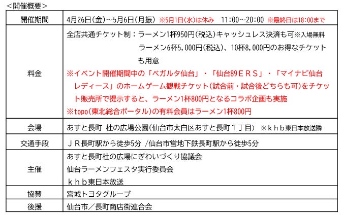 khb東日本放送(本社:仙台市太白区)は、4月26日(金)~5月6日(月振)の期間「仙台ラーメンフェスタ 2024」を開催します。※5月1日(水)は店舗入れ替えのため休み