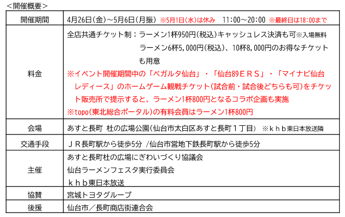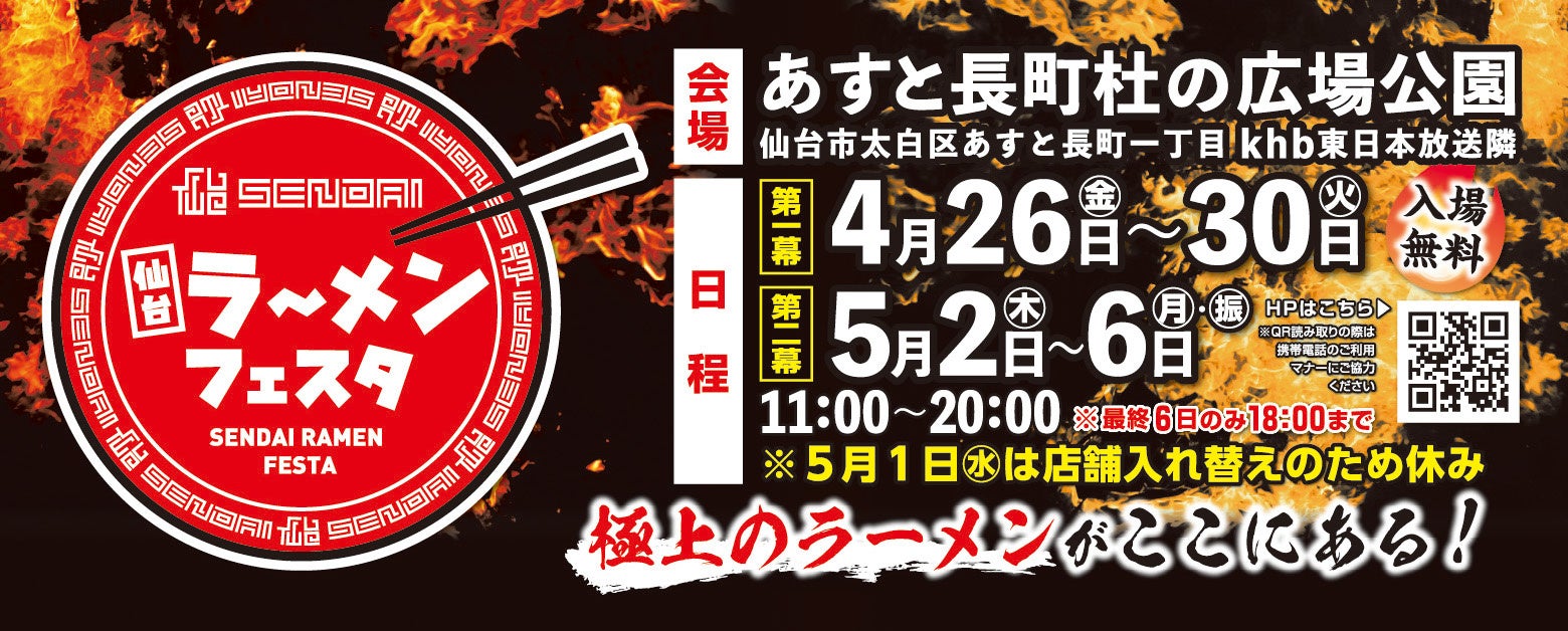 khb東日本放送(本社:仙台市太白区)は、4月26日(金)~5月6日(月振)の期間「仙台ラーメンフェスタ 2024」を開催します。※5月1日(水)は店舗入れ替えのため休み