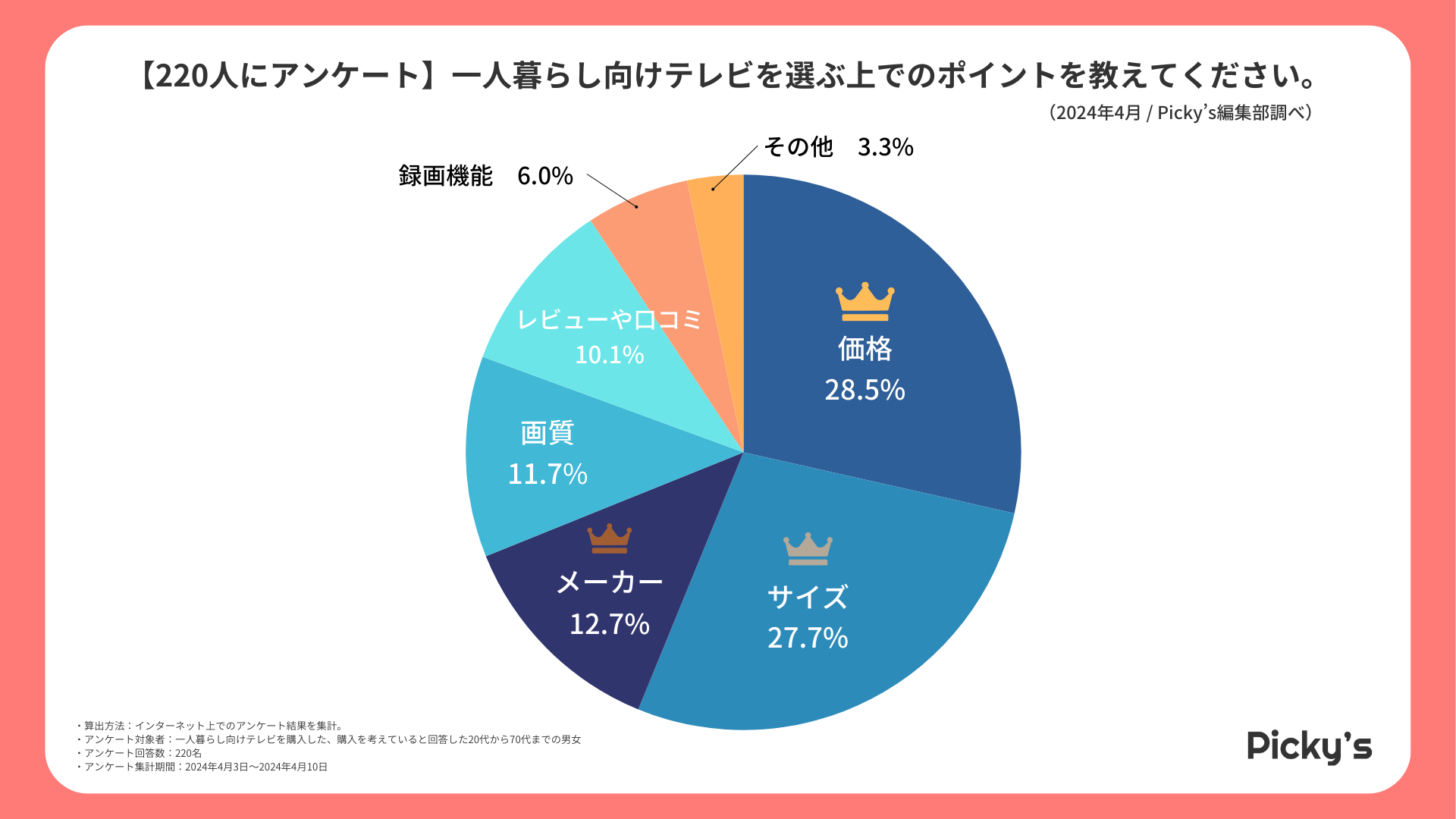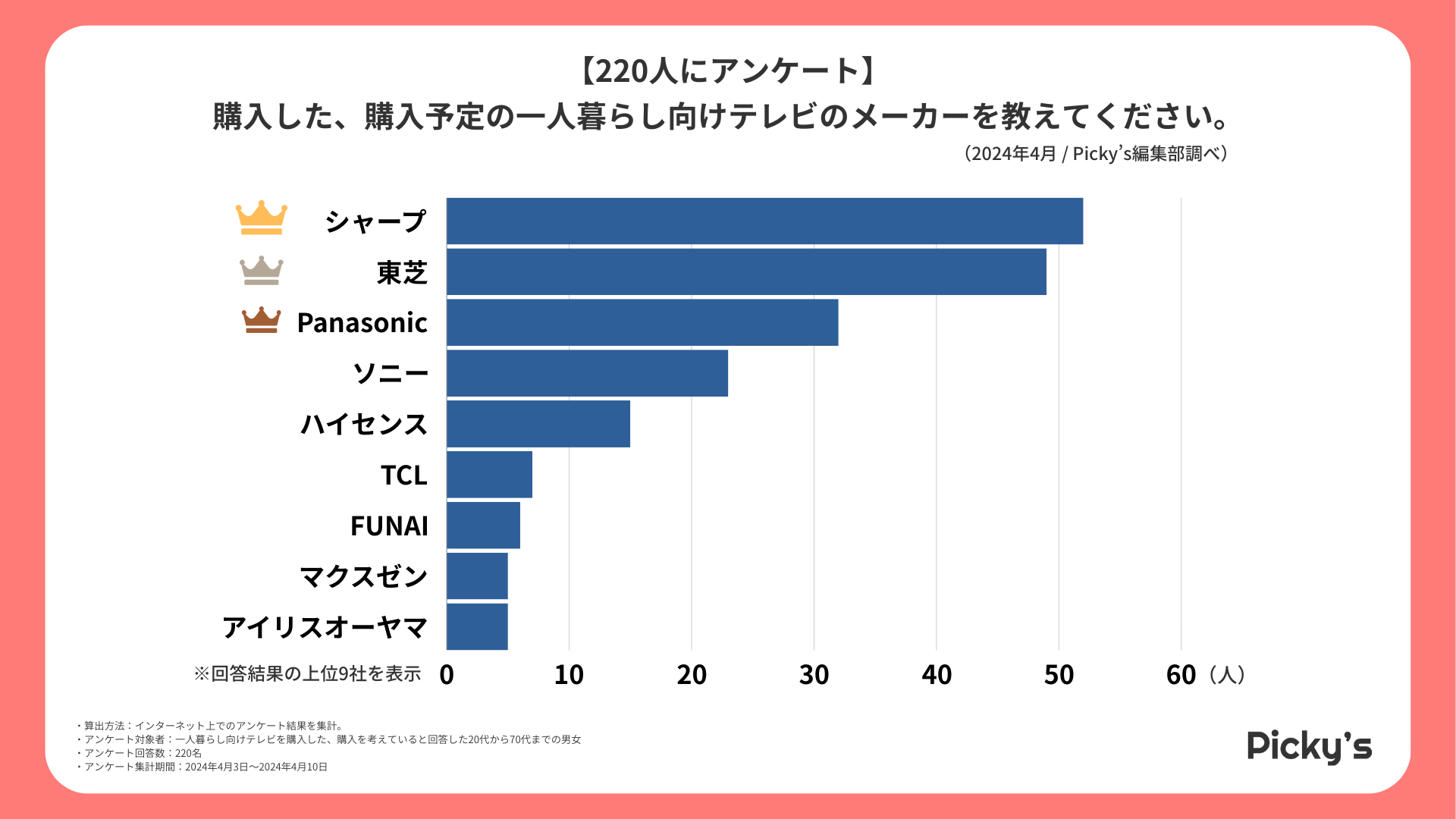 「Picky’s」は、インターネットショッピングにおいて、購入前に試せない・選ぶべきものがわからないという課題の解決を目標に、あらゆる商品のおすすめランキングや検証レビューを紹介するサイトです。このたびPicky’s(https://rentry.jp/)では、春の新生活に先駆けて、一人暮らし向けテレビについてインターネット上でアンケート調査を行いましたので発表いたします。