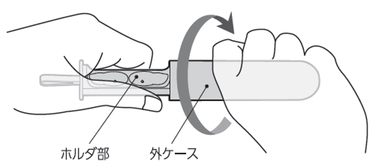1. 充電ケースをスライドオープンした状態で、外ケ-スとホルダ部を持って約90°ひねり、内ケースをとり出します。