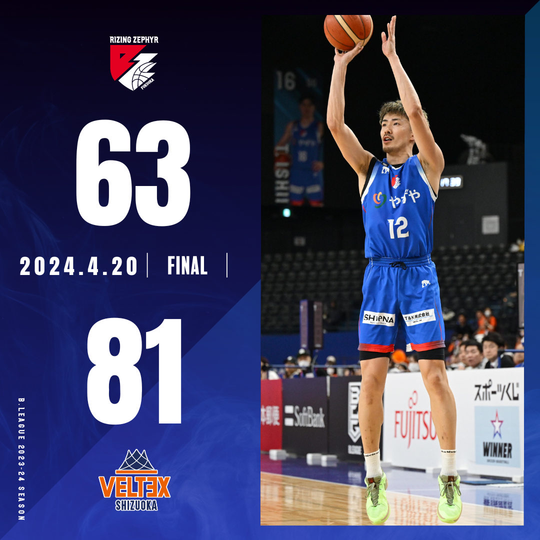 2024年4月20日(土)に開催されました【ライジングゼファーフクオカvs.ベルテックス静岡】において“福岡81-63静岡”の結果となりましたことお知らせいたします。