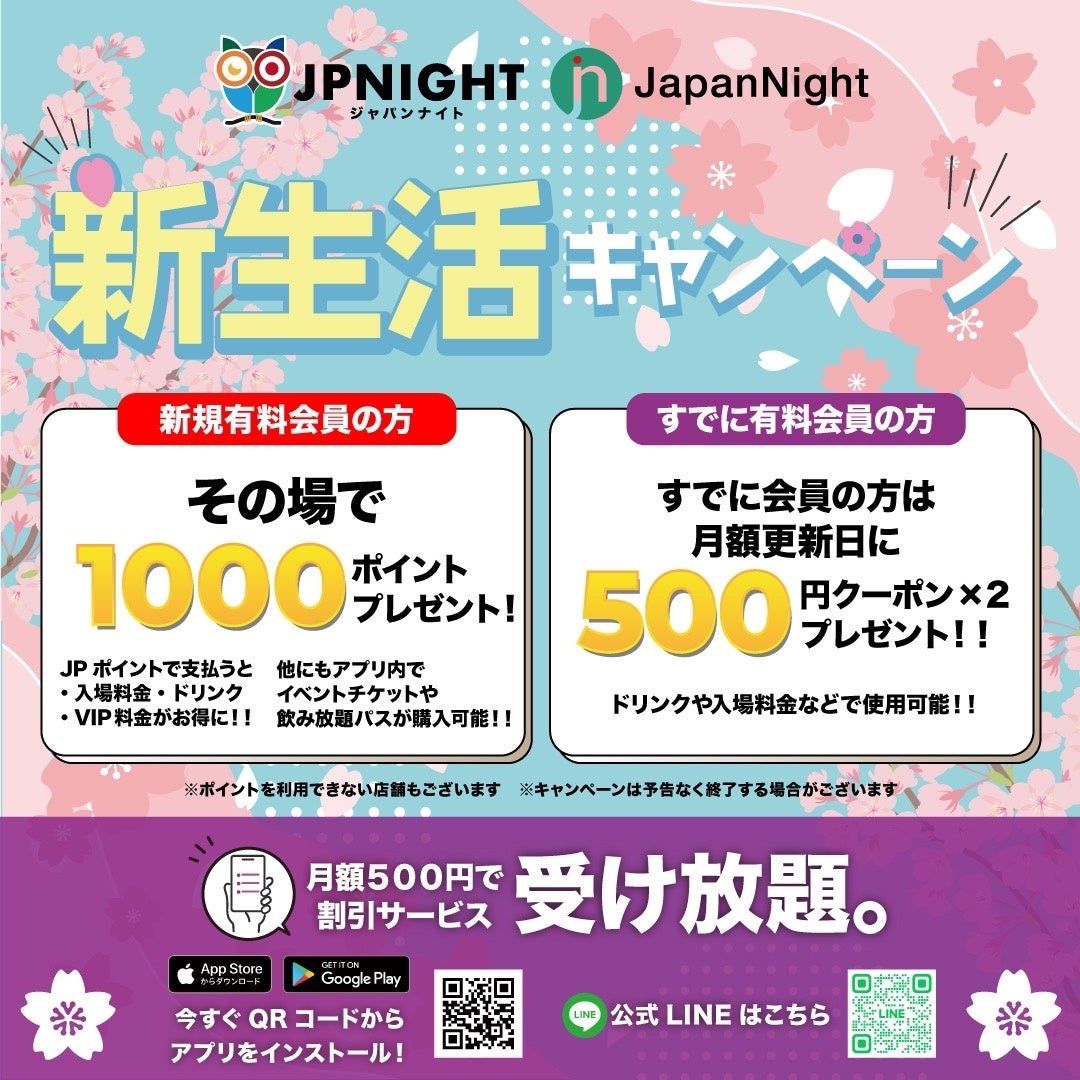 有料会員に新規登録した場合は1000ポイントGET!JP Nightなら月額500円で割引サービス受け放題!!