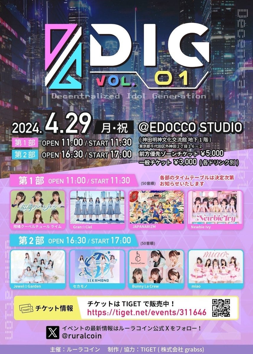 ルーラコイン Presents DIG vol.1は、「アイドル✖️NFT」で「推し活」にイノベーションを起こし、新しいユーザー体験を提供する次世代のアイドルフェスです。アイドルの聖地、「AKIBA」でWEB3.0型のアイドルフェスを創り上げていくプロジェクトとなっています。