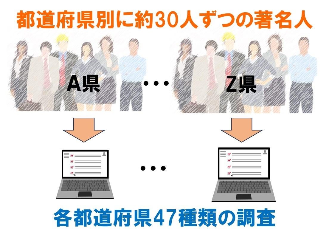 調査は、47都道府県それぞれの調査票「△△県の著名人に関する調査」を作成(都道府県ごとに異なった著名人が掲載されています)、すなわち47種類の調査票を作成しました。それらに、それぞれの都道府県に居住している回答者が回答するという仕組みです。