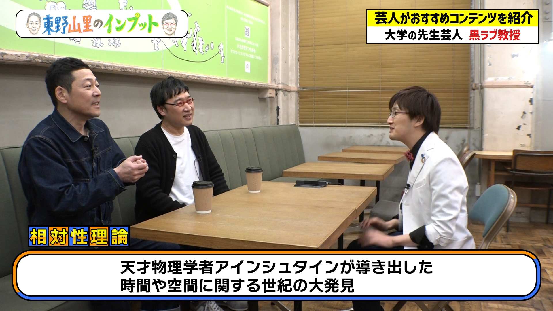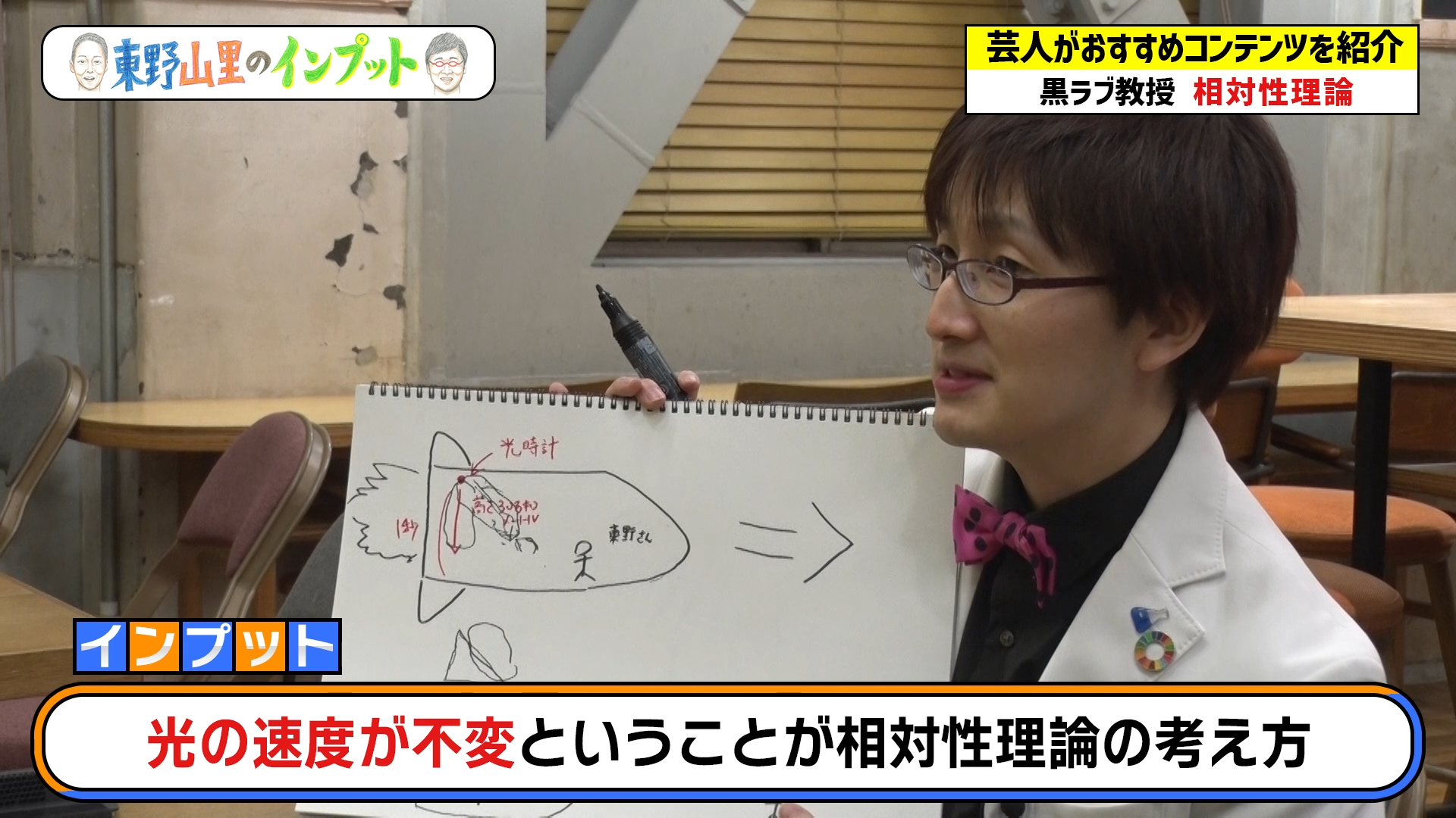 そんなふたりに黒ラブ教授が「相対性理論はどういうことを言っていると思いますか?」と質問。東野が、ある例えを用いて答えると「そうなんです!」と返します。