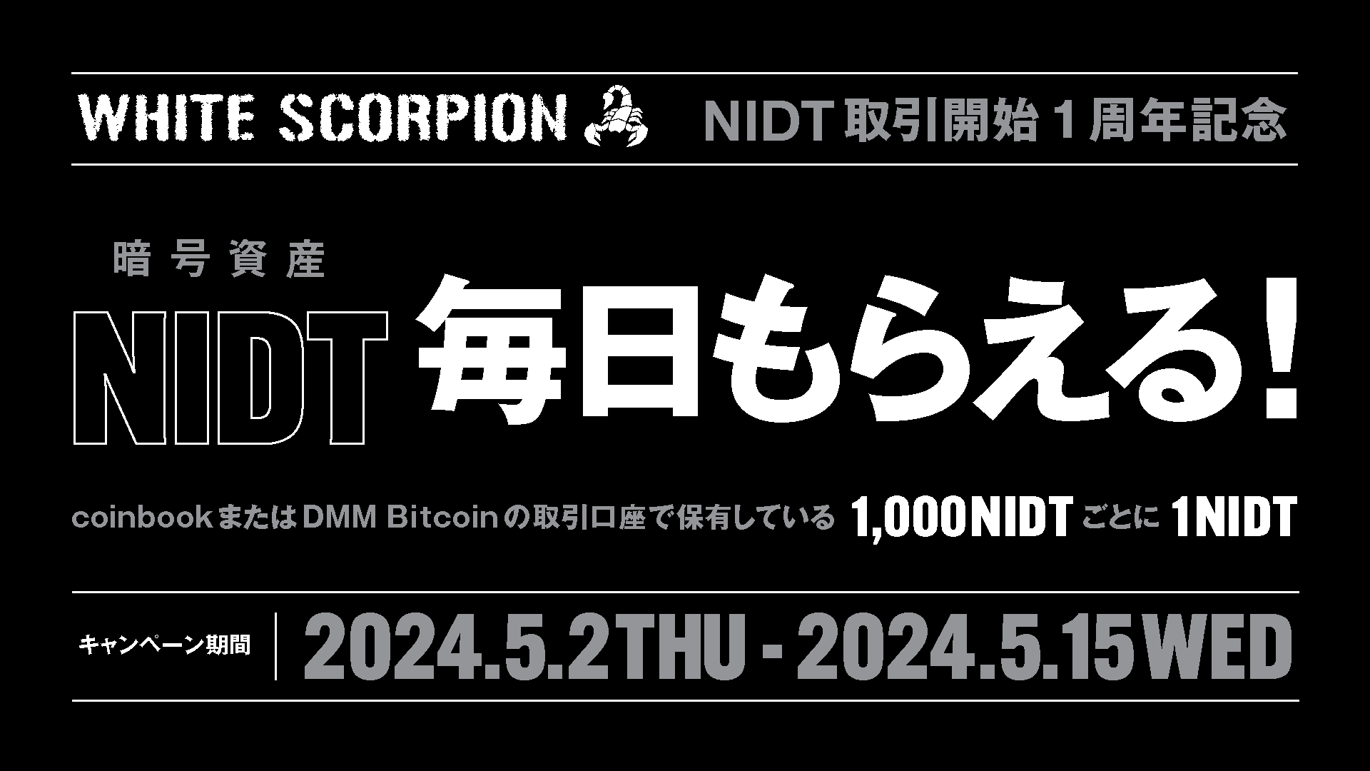 このたび、NIDTのIEOにご参加いただき、またNIDTを保有していただいている方々への感謝の意を込めて、NIDT取引開始1周年を記念したキャンペーンを実施することとし、本キャンペーンを通じてNIDTの認知度をさらに高めていくとともにNIDTのより一層の価値向上に努めてまいります。