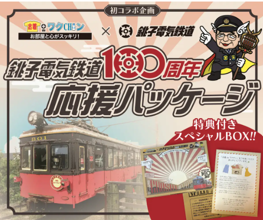 古着deワクチンは、ご不要になった衣類や服飾雑貨等を手放すことで、開発途上国の子どもたちのポリオワクチン接種支援や国内外の障がいを持つ方々の雇用促進など、様々な社会貢献に繋がる有料の「自立支援型・寄付つきお片づけ商品」です。100周年応援パッケージを購入(すでに販売終了)されると、その応援資金の一部は、銚子電鉄導入新車両(中古)に充てられる仕組みとなっておりました。