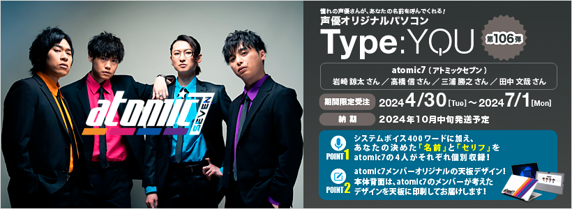 声優オリジナルパソコン「Type:YOU-タイプユー-」第106弾 シリーズ初のユニット【atomic7(岩崎諒太さん、高橋信さん、三浦勝之さん、田中文哉さん)】モデルを4月30日(火)より受注開始!
