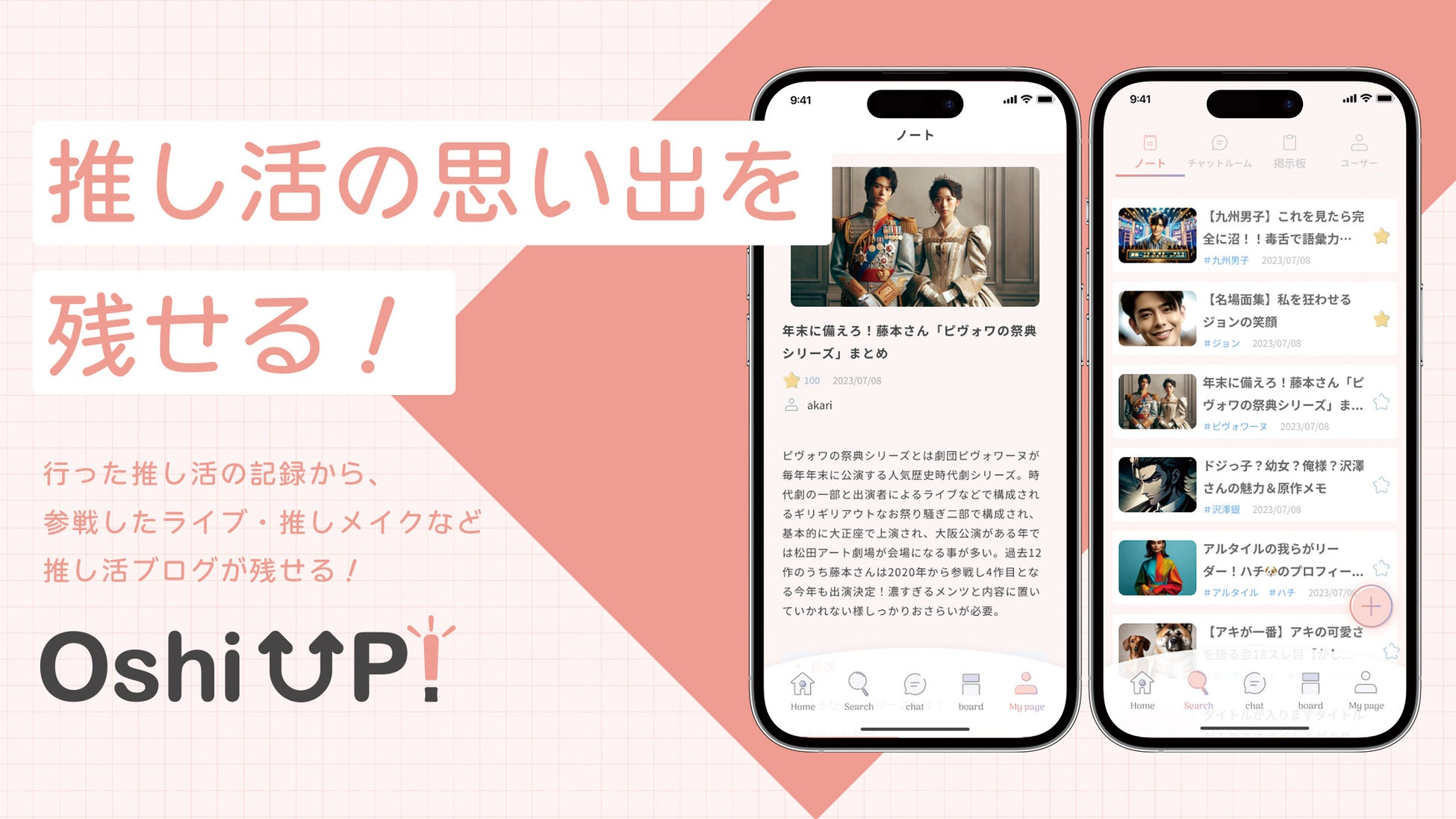 推し色にカスタムしたり、推しポイントや魅力などを自由にレイアウトすることができるマイページや、推しの出ている番組・ライブなどを見てリアルタイムで盛り上がれるチャット機能、掲示板、その日の”推しごと”をブログとして書くことができるノート機能など、推しの舞台公演全通しているアイドルオタク歴10年以上の現役女子大生3人が企画した最強の推し活サービスです。