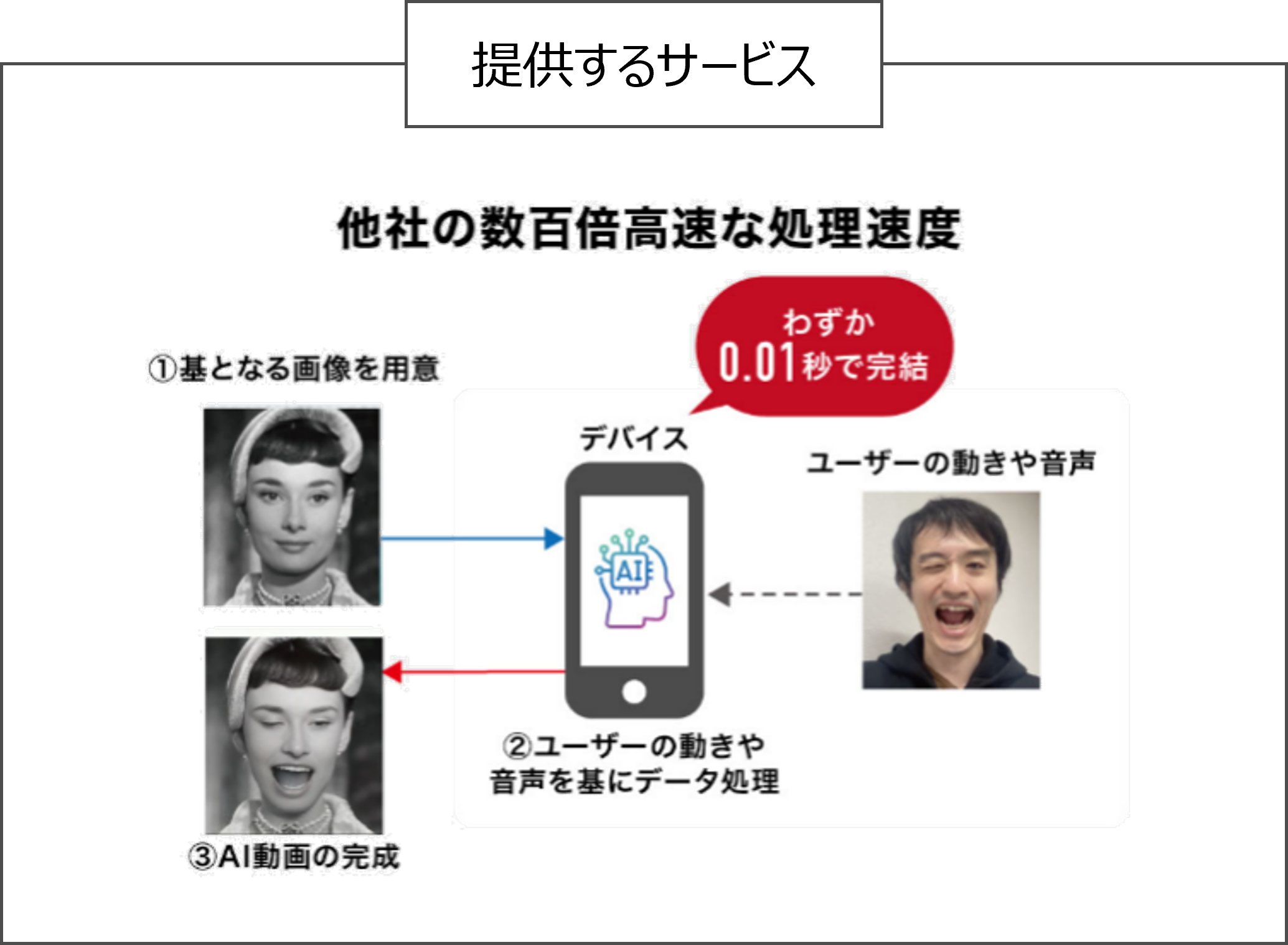 EmbodyMe社は、「『学習し模倣するAI』から『想像し創造するAI』へ」をミッションに、映像生成AIの基盤技術を開発する会社です。EmbodyMe社のコア技術は、従来の技術では困難であったリアルタイム性を克服し、タイムラグわずか0.01秒という超高速な映像生成AIを実現しております。