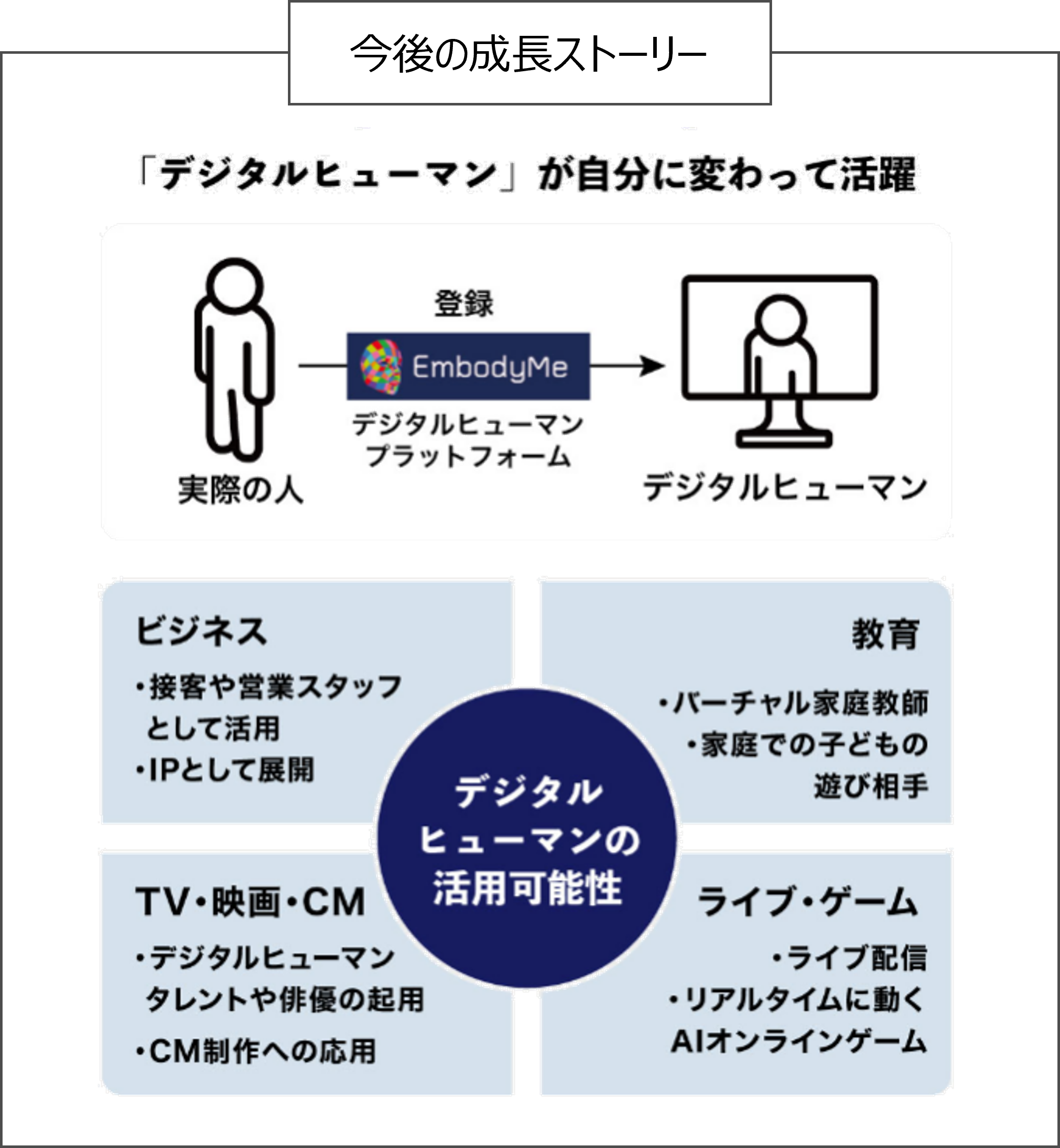 近い将来、リアルタイム映像生成AIによって、人格や体を持った「デジタルヒューマン」が人と同じように社会で活躍する時代が到来します。映像生成AIによってコミュニケーションのあり方が大きく変わる時代に向けて、EmbodyMe社はデジタルヒューマンのプラットフォーム企業として世界を牽引して行きます。
