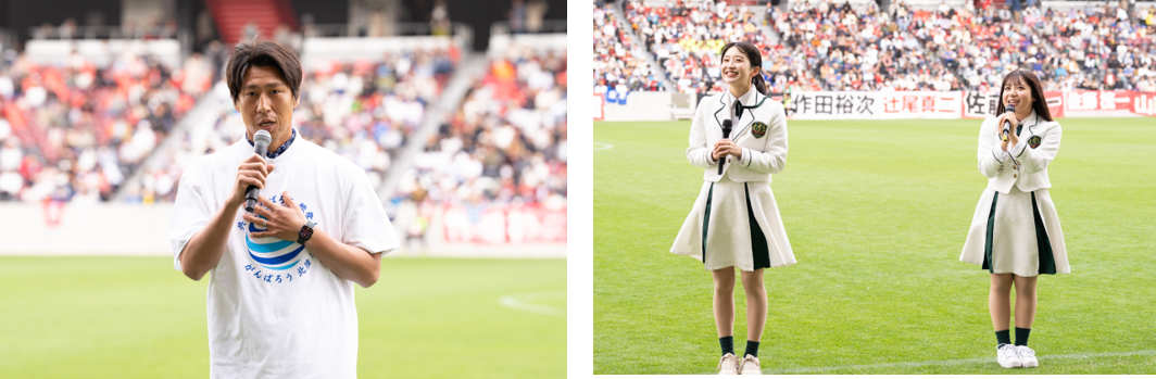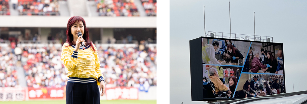 入られて、下水道やお水も使えないときだったので、皆さんの感染症をほんとに心配しておりました。」と被災者の健康を気にかけながら「このスタジアムの熱気や活気をそのまま被災地に届けられたらいいなと思っております。」と話しました。