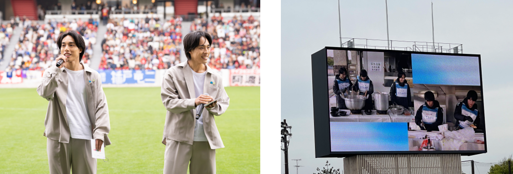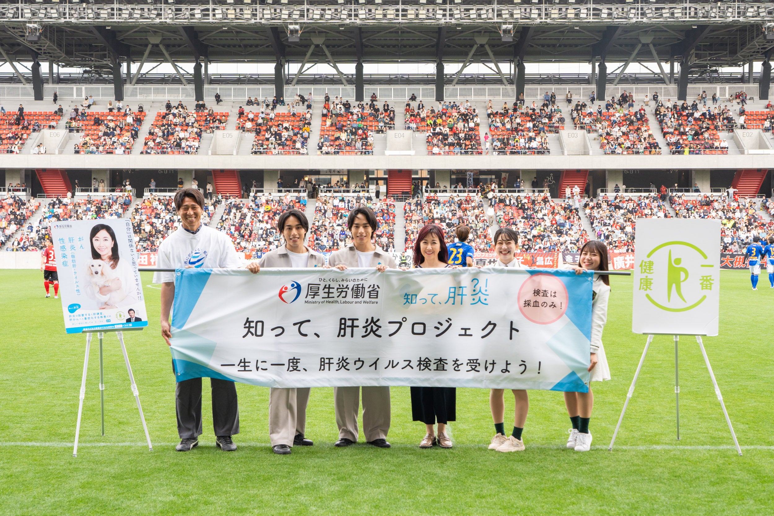 4月20日(土)に、令和6年能登半島地震 復興応援チャリティーマッチが石川県金沢市で開催され、宮本恒靖さん、中澤佑二さんら「ブルーレジェンズ」対石川県にゆかりのある選手の「がんばろう石川」の試合が行われました。ハーフタイムに【知って、肝炎プロジェクト】特別プログラムを実施し、「知って、肝炎プロジェクト」肝炎対策特別大使の伍代夏子氏と、一卵性三つ子のインフルエンサー佐藤三兄弟の綾人氏と嘉人氏が出演し、スタジアムに集まったサポーターの皆さんに向けて、「ご自身の健康を考えて、定期的な健康診断や病気の検査を受けていただきたいです。」と呼びかけを行いました。
