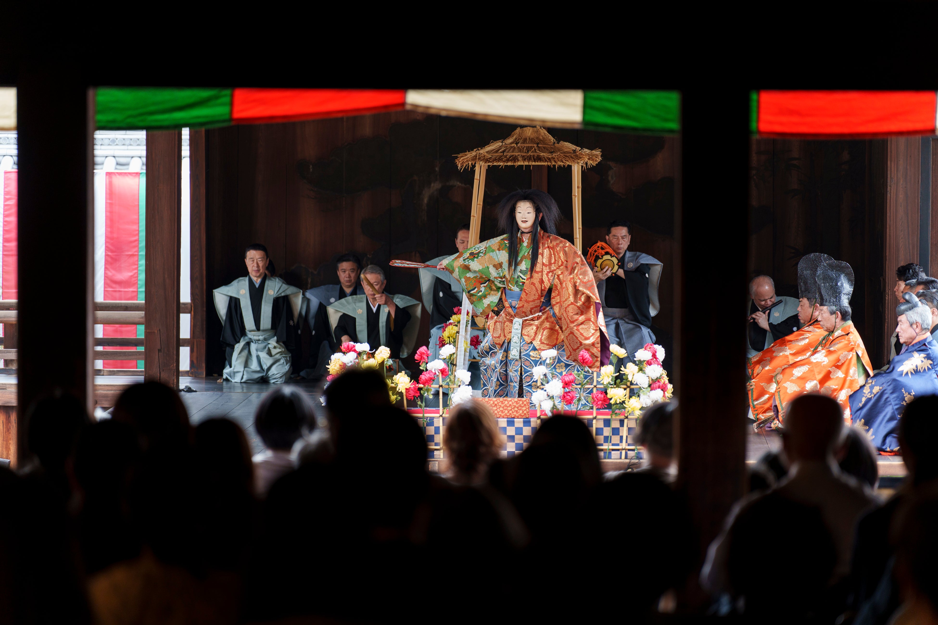 西本願寺と能の関係は歴史が長く、第8代宗主(しゅうしゅ)蓮如上人(れんにょしょうにん)の頃に始まり、降誕会での祝賀能は明治20年代半ば頃から恒例となりました。演能は京都観世会による公演となり、観世流の関西所司代格である片山家が中心となり演じられます。