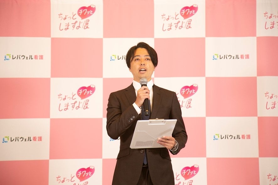 オープニングイベントの冒頭では、レバレジーズメディカルケア株式会社 執行役員 小西 東が登壇しました。小西は、「『レバウェル看護』は、サービスを提供していく中で、毎日たくさんの看護師さんの悩み相談に乗っております。その中で、看護師という職業は、生活する上で誰もが関わったことがある職業であるにも関わらず、専門職種がゆえに、実は世間では知られていないような、看護師ならではのストレスや悩みが多くあることが分かりました。また、ストレスなどの精神的な負担を理由にして、転職や離職のご相談をいただくことも多くある実態となっております。これらは、医療現場という、より負荷がかかりやすい労働環境によるものだと考えています。同僚との関係性だけではなく、患者さんや患者さんのご家族との関係性など、看護師特有の様々な要因によって引き起こされている問題があり、大変ストレスを抱えやすい職業なんじゃないかなと、日々感じております。こういった背景から、わたしたち『レバウェル看護』は、普段はなかなか周りに言えない看護師さんの本音を、展示イベントという形で可視化することで、看護という仕事の『リアル』や、職業実態をより多くの方に知ってもらう機会を提供できたら」と説明しました。