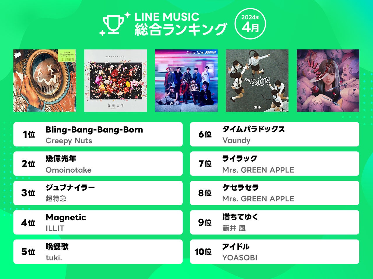 2024年4月の月間ランキング1位は、2月の月間ランキングから3か月連続でCreepy Nutsの「Bling-Bang-Bang-Born」が首位に輝きました。TVアニメ『マッシュル-MASHLE-』の主題歌として話題となり、3/8に公開された「Bling-Bang-Bang-Born」の『THE FIRST TAKE』は、5/1現在で5,000万回再生を突破、ストリーミング再生は累積3億回再生を超えと、その勢いは止まらず注目を集めて続けています。