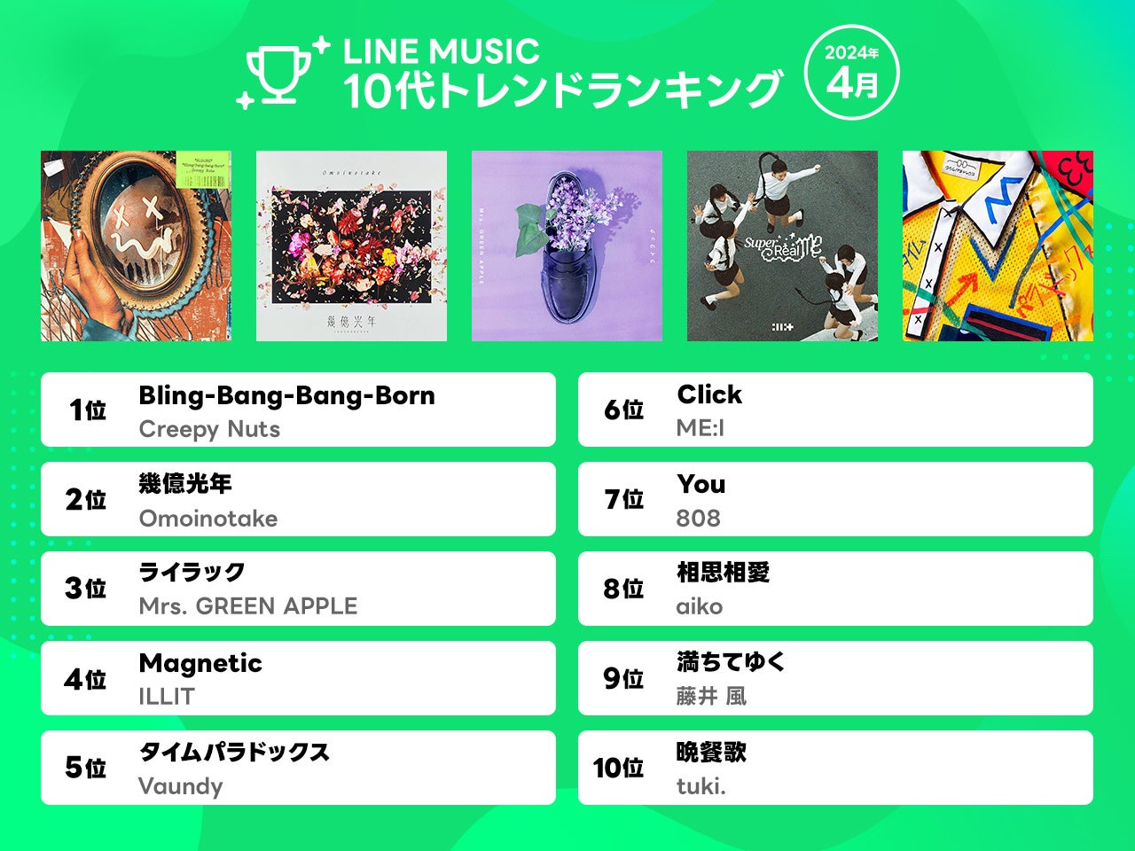 ほかにも、4月の10代トレンドランキングでは、aiko「相思相愛」(劇場版『名探偵コナン 100万ドルの五稜星』主題歌)が8位、なとり「絶対零度」(TVアニメ『WIND BREAKER』オープニング)が39位にランクインするなど、アニメタイアップ楽曲が多くランクインする結果となりました。