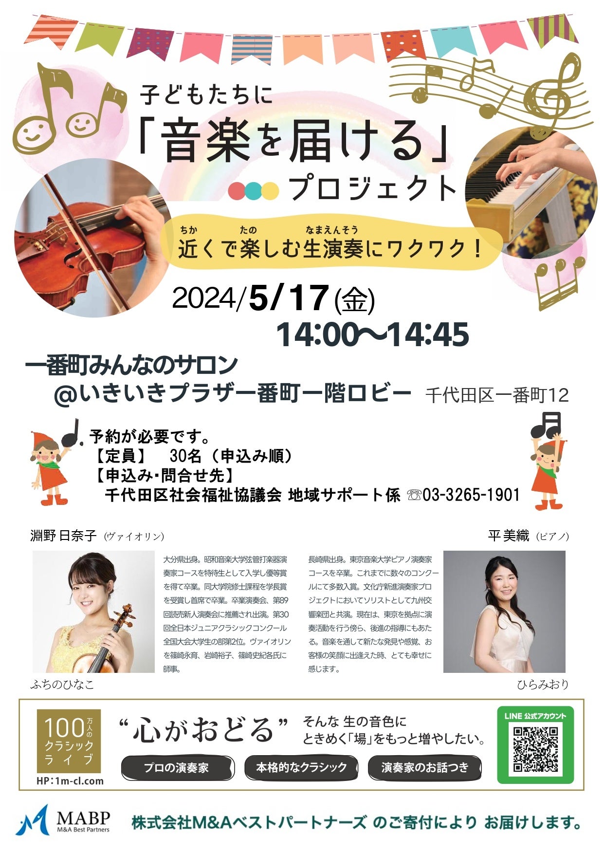 今回のクラシックライブは、M&Aベストパートナーズと100万人のクラシックライブの活動*の第44弾として開催するイベントとなります。「子どもたちに音楽を届けるプロジェクト」への支援として、“心がおどる”生の音色にときめく「場」の創出、感動の分かち合い、笑顔の人の輪を広げていくことを目指します。当日は、演奏家による解説つきでお届けいたします。