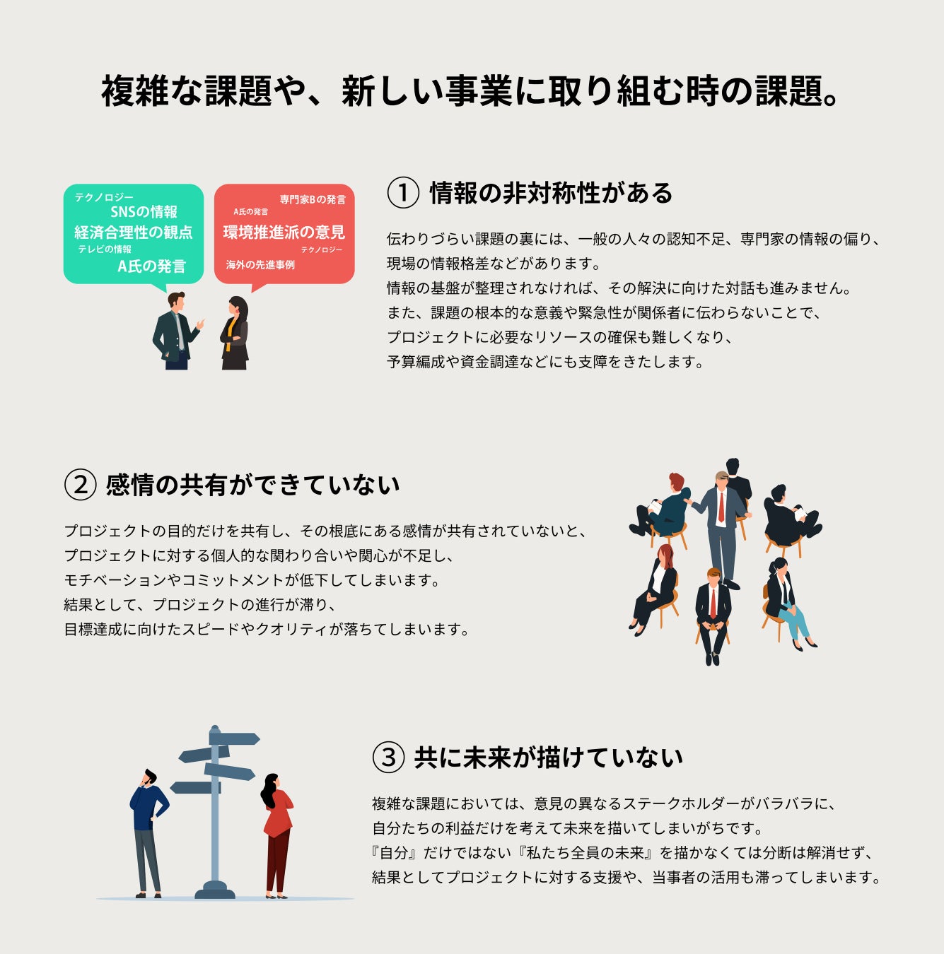 しかし、複雑な課題のある現場においては「情報の非対称性」「感情の共有不足」「共創意識の欠如」などがハードルとなり「全ての関係者がそもそも対話のスタートラインにすら立てない」という課題があります。