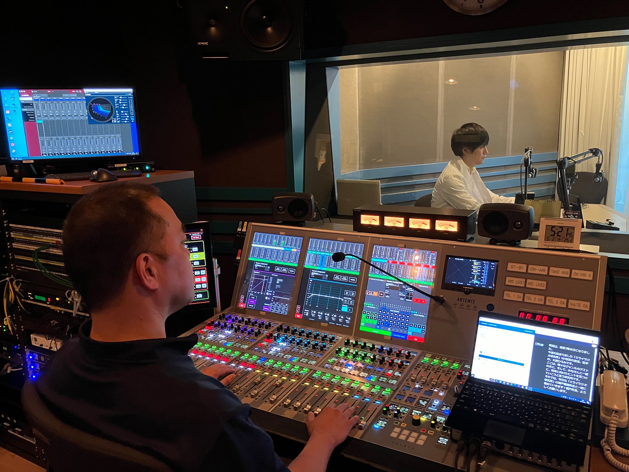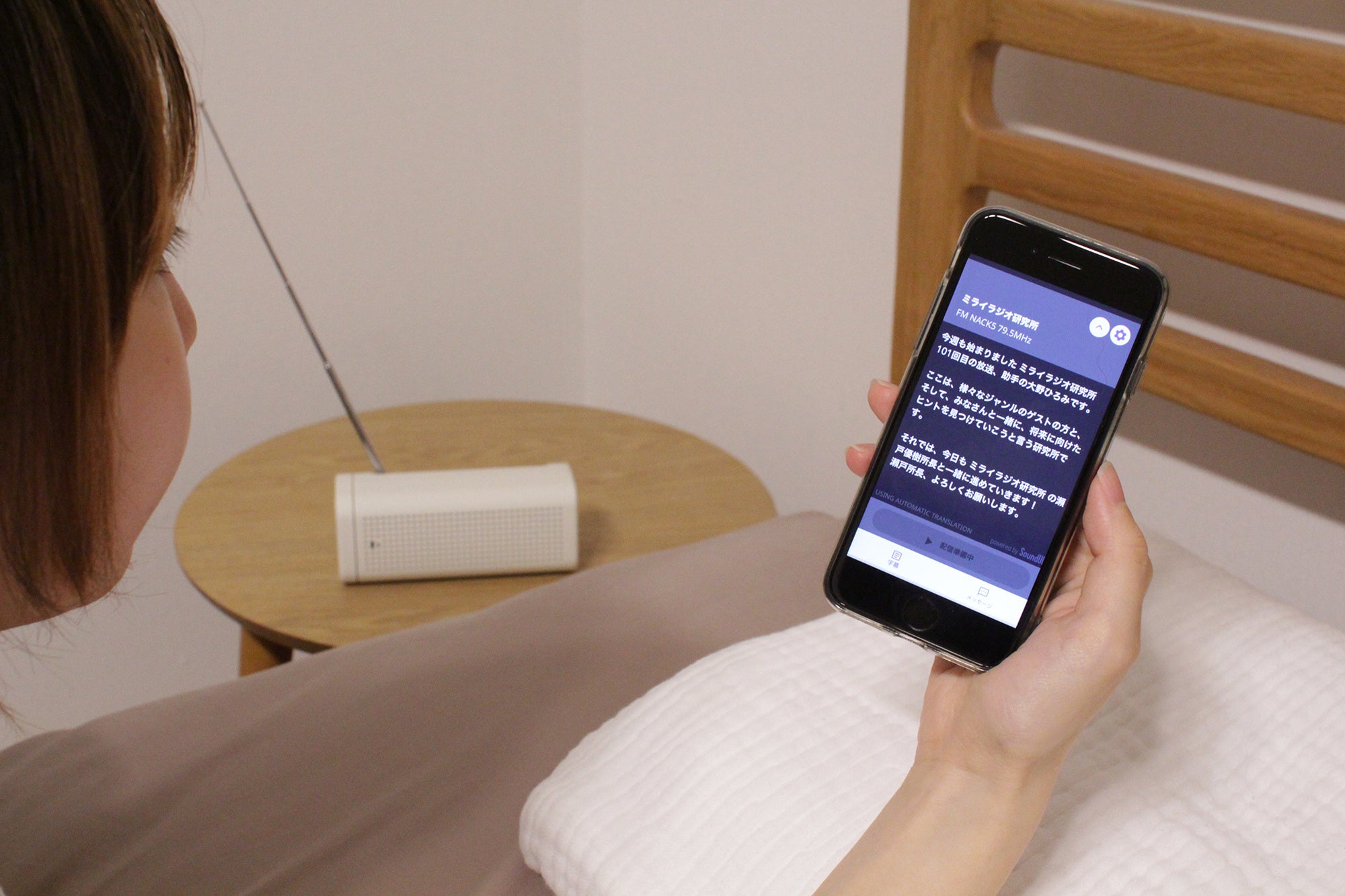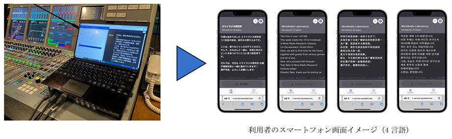 ラジオ局では、放送用ミキサーとSoundUDのシステムをつなぎ、番組の音声をリアルタイムに文字化・多言語化し配信します。文字を閲覧したいユーザーは、番組の公式サイト(https://www.nack5.co.jp/program/future_radio_laboratory/)などからアクセスできるスマートフォン向けのサイト「おもてなしガイド」より簡単な操作で文字情報を閲覧できます。(アプリは不要です)