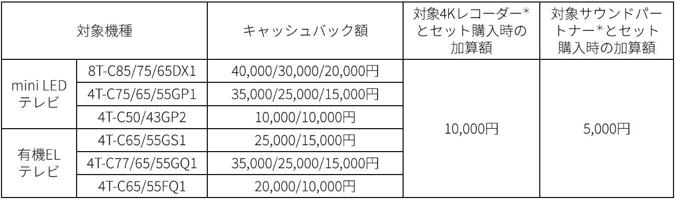 ■ 概要:対象機種を購入の上、キャンペーンサイトに必要事項を記載してご応募いただいたお客様に、機種に応じた金額(40,000円から10,000円まで)をもれなくキャッシュバック。テレビに加え、対象の当社4Kレコーダーまたは『AQUOS サウンドパートナー』をセットで購入のお客様には、それぞれキャッシュバック額10,000円、5,000円を加算します。セブン銀行「ATM受取」での受け取りとなります。