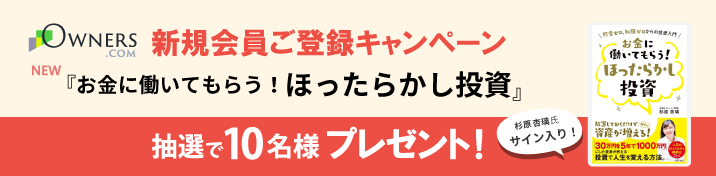 今回の動画は会員限定の公開となっております。キャンペーン期間中にOWNERS.COMに新規会員登録された方の中から、抽選で10名様に杉原杏璃氏の著書『お金に働いてもらう!ほったらかし投資』を直筆サイン入りでプレゼントいたします。是非この機会にご登録ください。