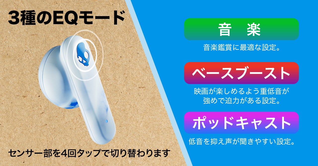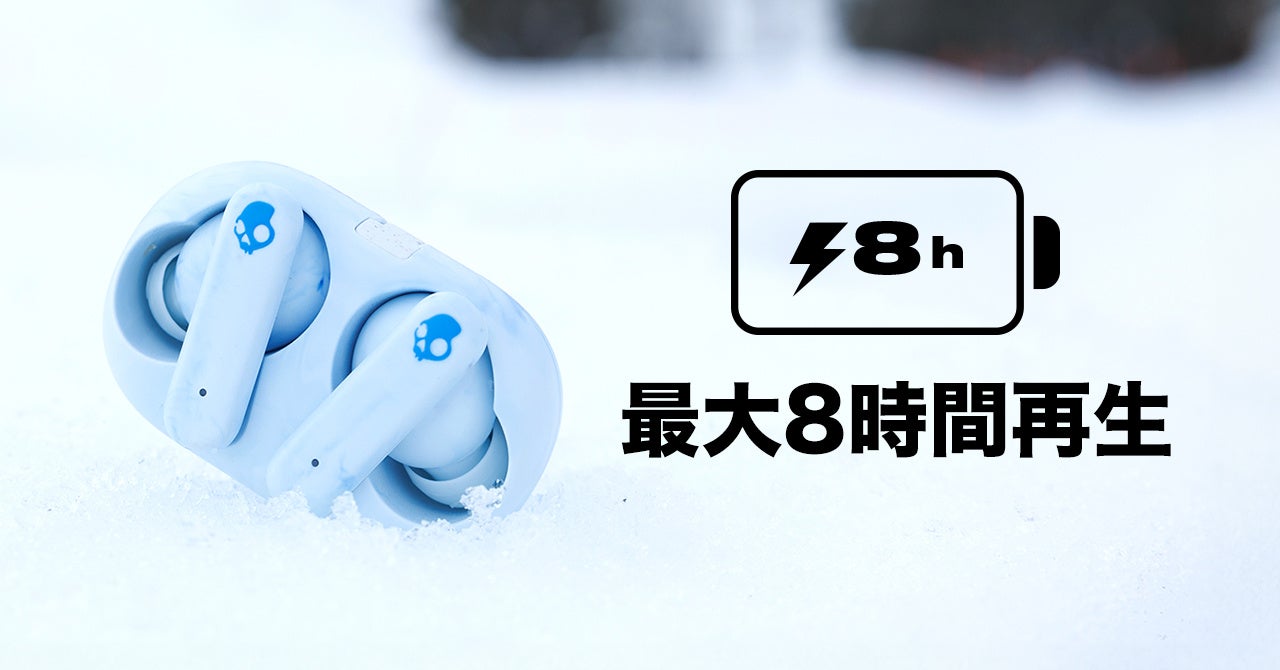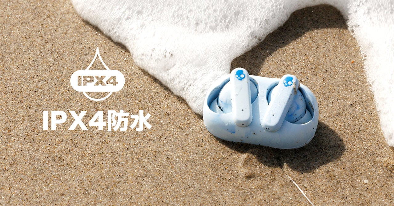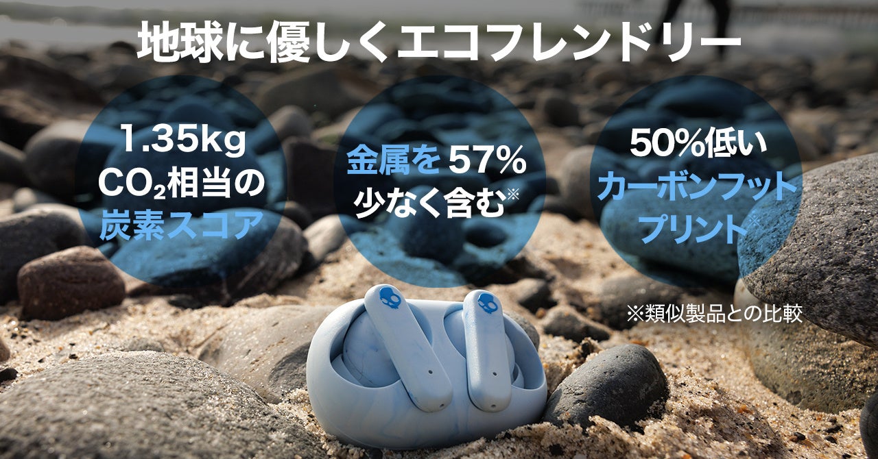 バッテリー非搭載で蓋のないケースは地球に優しく、イヤホンは抜群のSkullcandy重低音サウンドを響かせます。主要な機能を搭載し、メインの完全ワイヤレスイヤホンとしても活躍します。