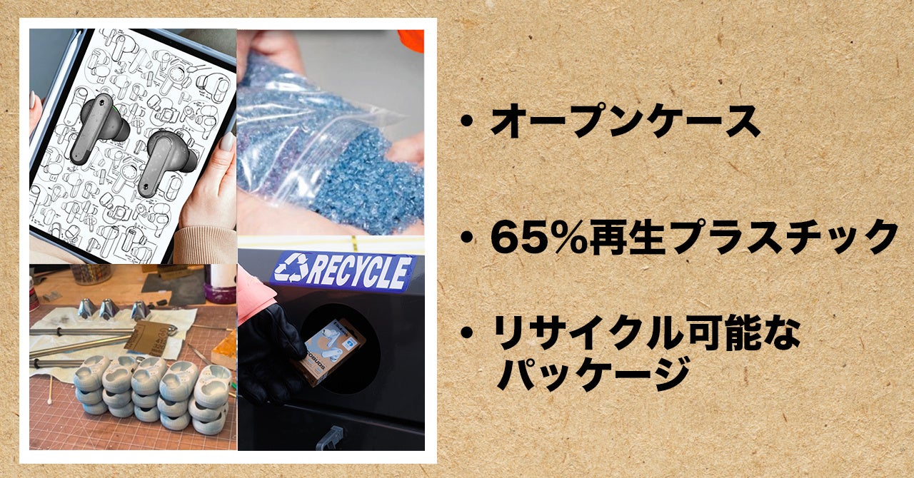 オープンケースは、プラスチックの使用を最小限に抑えたデザインです。再生プラスチックを65%使用しており、環境への影響を最小限に抑えています。すべてのSkullcandy製品は100%再利用可能なパッケージを採用しており、地球を守るために環境に優しい取り組みを行っています。使用後は、ぜひリサイクルボックスに捨ててください。