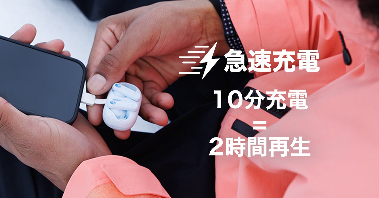 10分充電で2時間再生が可能な急速充電に対応しています。スマホやパソコンからも急速充電が可能です。充電はケースに組み込み込まれたUSB Type-Cケーブルを使用します。