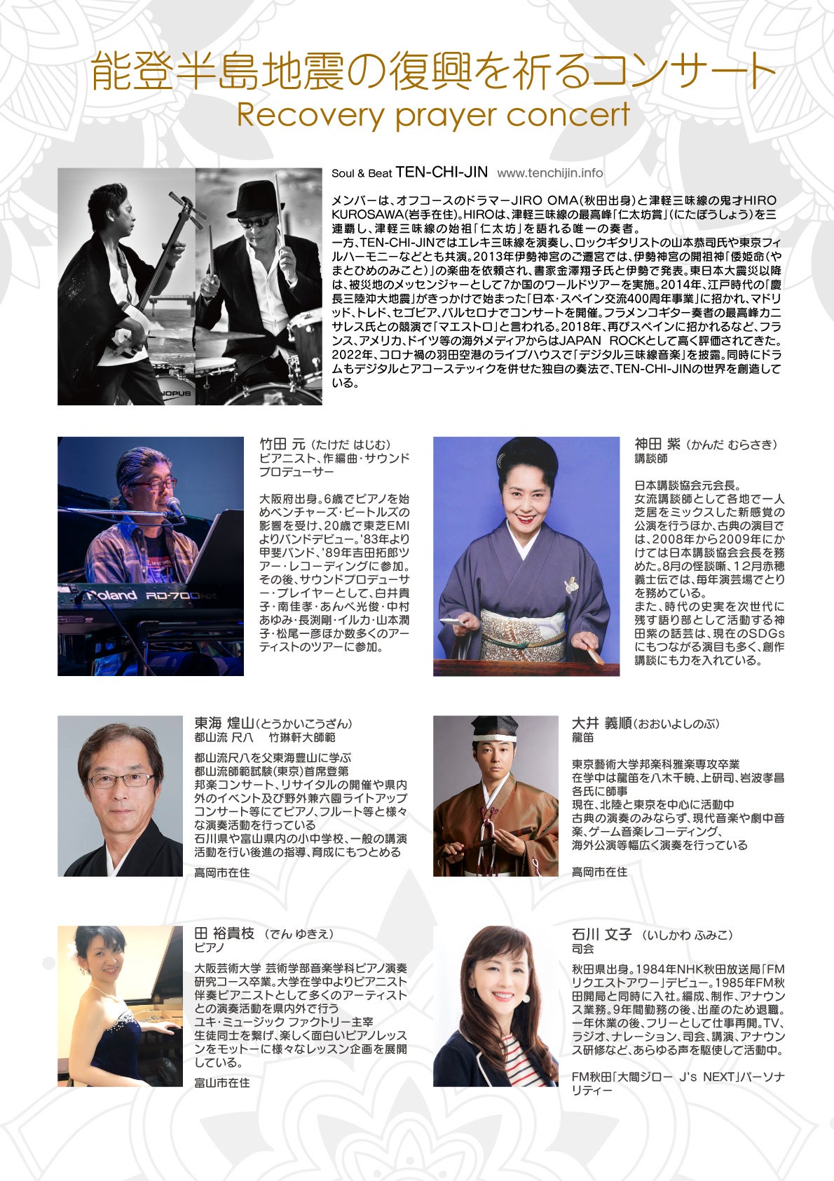 株式会社ジェイ・ユー(東京地渋谷区)が共催者となり、地元の音楽家などのアーティストもボランティア出演し、音楽を通じて能登半島地震の被災者の「心の復興」の一助となることを目指します。YouTubeによるライブ配信も行い、いずれも参加費は無料です