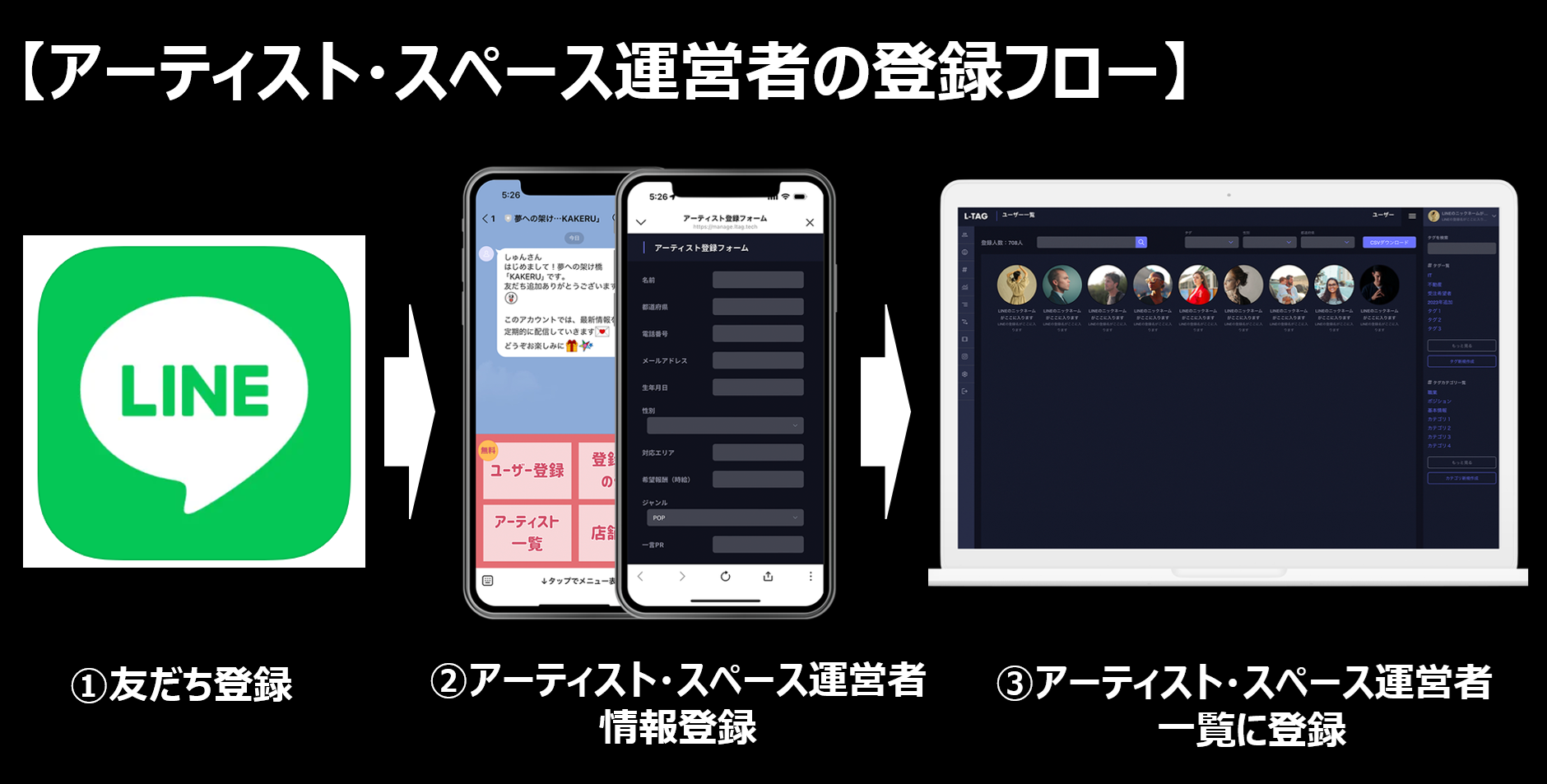 会員登録はLINEの「友だち登録」からアーティストもしくはスペース運営者の情報登録を行うことで終了し、各一覧ページに登録表示されるようになります。