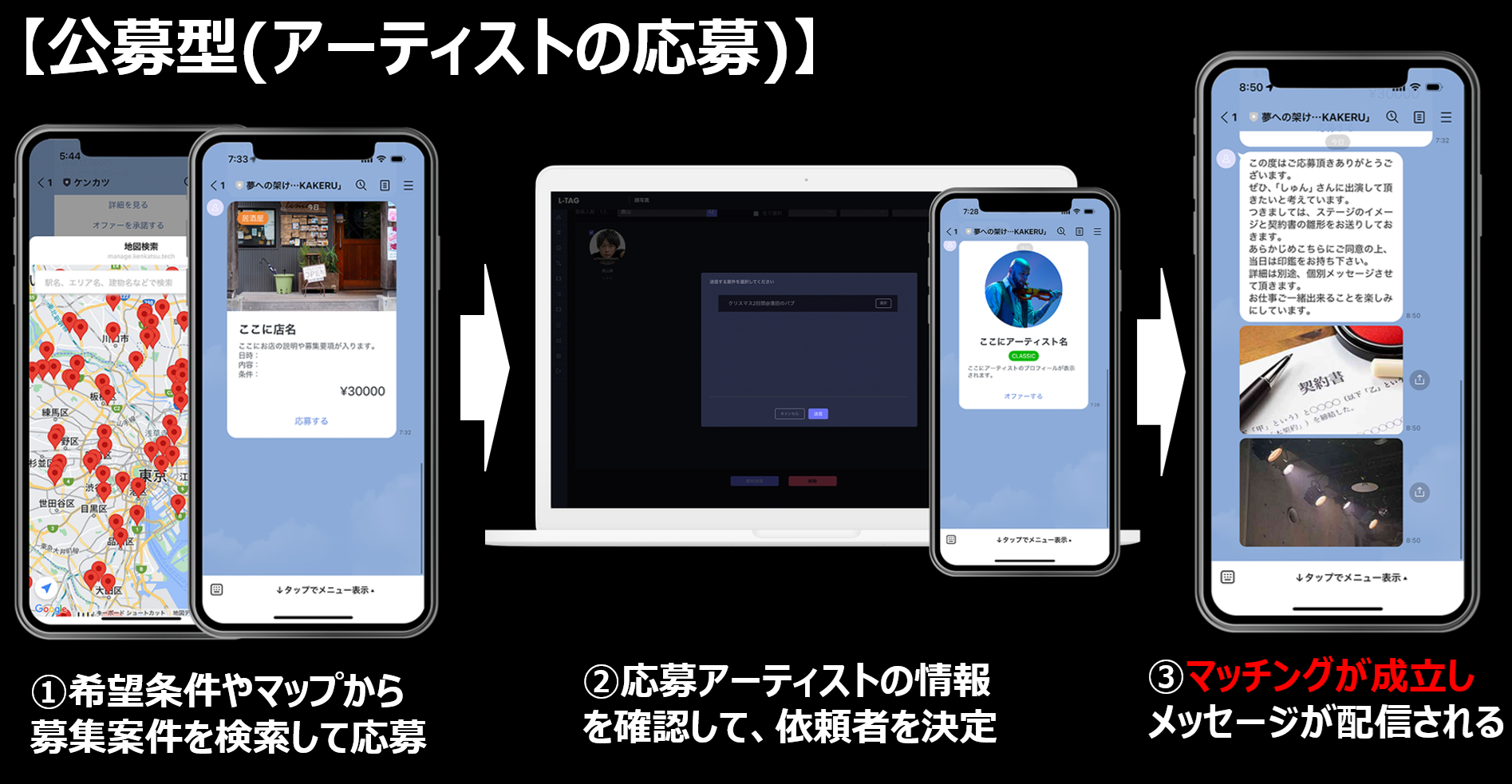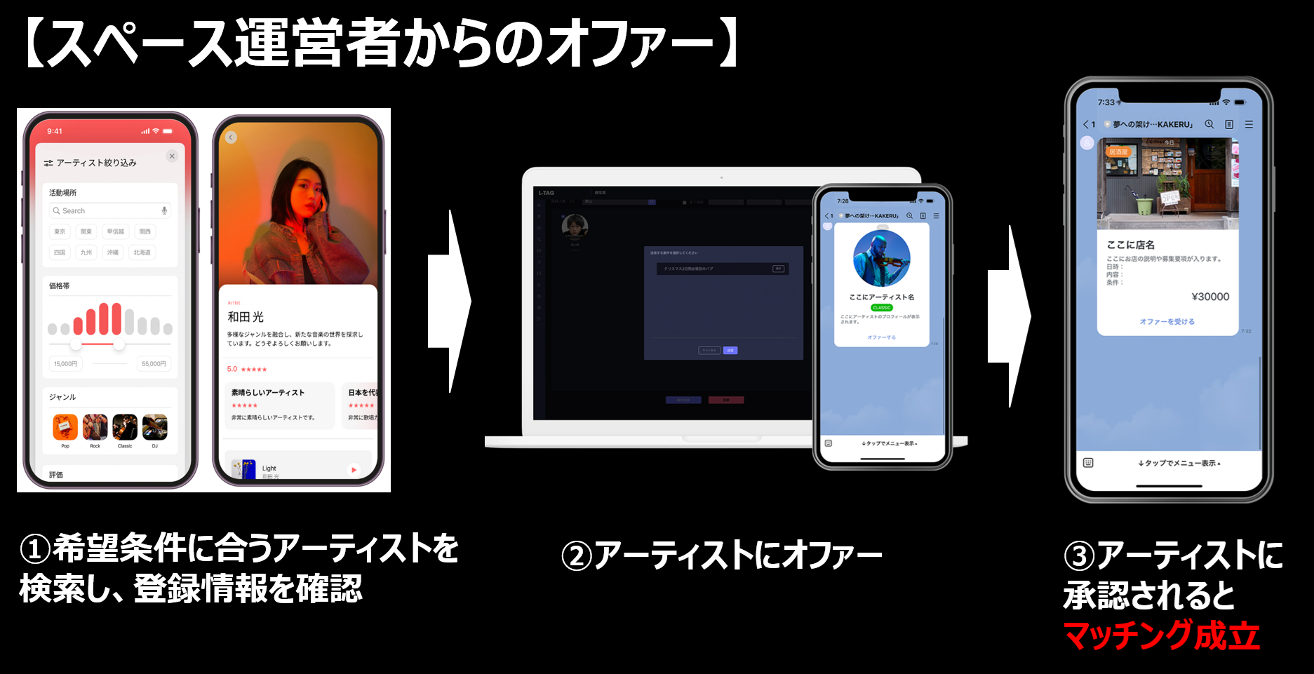 2つ目はスペース運営者の登録情報や募集案件を確認したうえで、アーティストから応募します。応募を受けたスペース運営者もアーティスト情報を確認したうえで、オファーを承認するとマッチングが成立します。