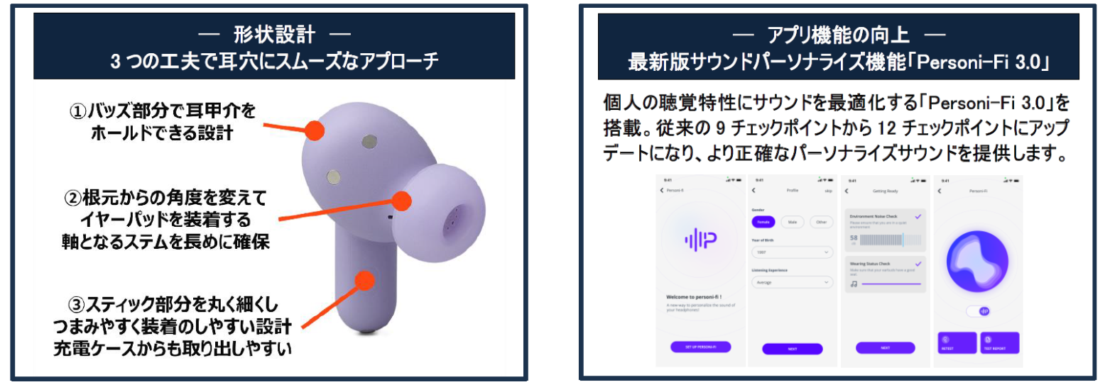 装着時の違和感や痛みなど、完全ワイヤレスイヤホンならではの課題を解決するブランド独自の「ショートスティック型」デザインを継承。複雑な三次元形状から成る耳を密閉するための形状と融合したような「ハイブリッドデザイン」を踏襲し、外から覆うような自然な密閉感で理想的な装着環境を実現しています。また、よりフィット感を高めるために開発した、人間工学に基づく外耳道の形状に合わせた「デュアルオーバルシェイプデザイン」により、物理的に耳を塞ぎノイズを遮断するパッシブノイズキャンセリングの向上や音質およびアクティブノイズキャンセリングの向上など、多くのメリットももたらします。さらに、形状設計・アプリ機能の向上・新ソフトの開発により、あらゆる型の耳で最高のフィット感を提供できるよう追究しています。