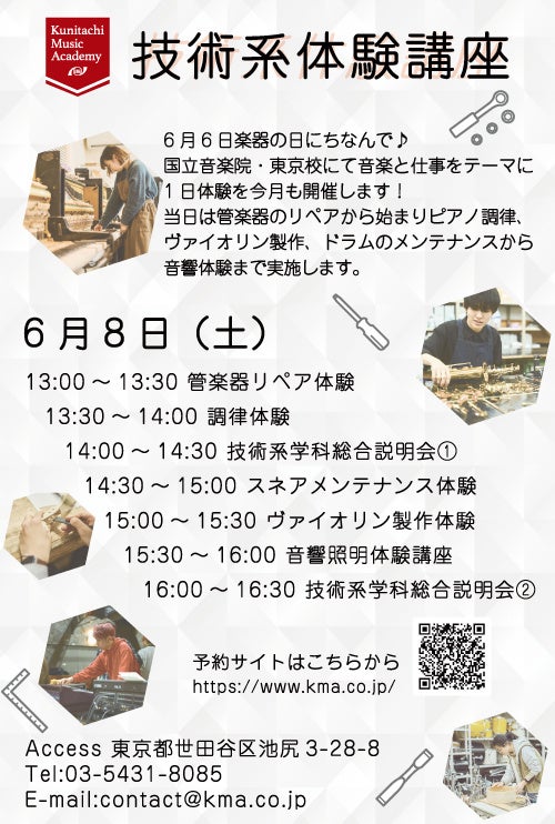 国立音楽院・東京校では、楽器の日にちなんで6月8日(土)に特別技術系体験講座を開催いたします。