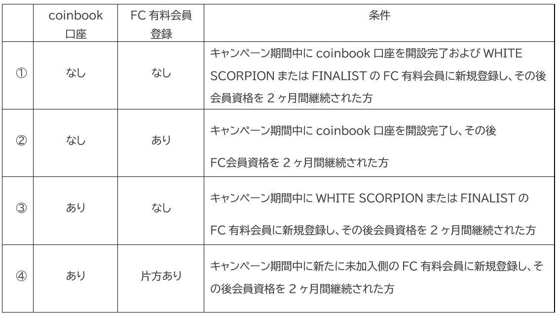 ※すでにcoinbook口座をお持ちでWHITE SCORPIONとFINALIST FCの両方とも有料会員の場合は本キャンペーンの対象外となります