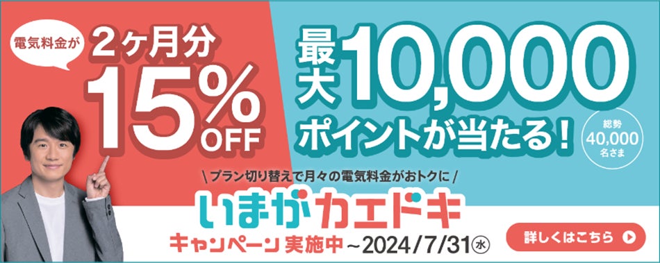 東北電力株式会社(以下「東北電力」)および東北電力フロンティア株式会社(以下「東北電力フロンティア」)は、お客さまのライフスタイルにあったお得な自由料金プランの加入拡大を目的として、本日から2024年7月31日までの期間、よりそう+eねっとバリューなど両社の7つの料金プラン※1へ新たにご加入いただいたお客さまの2カ月分の電気料金を15%割引※2する「いまがカエドキ」キャンペーンを実施します。