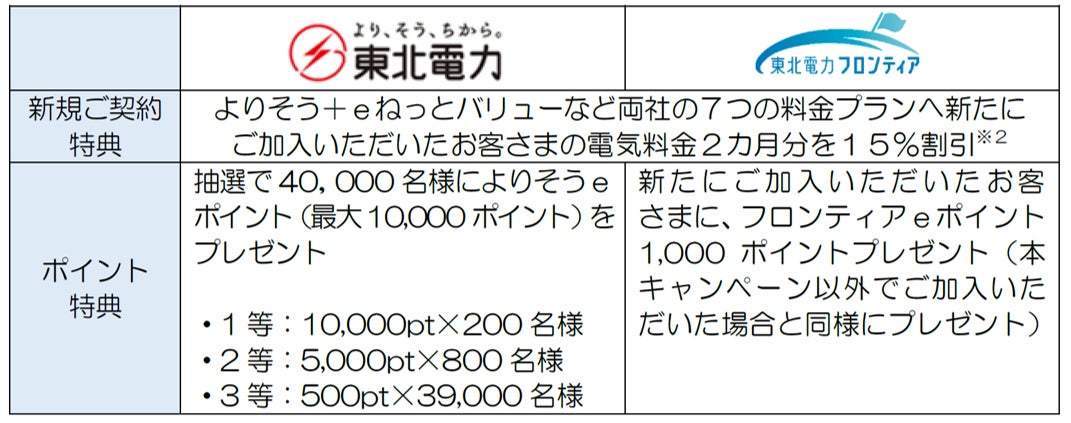 さらに、本キャンペーンでは、東北電力の会員制Webサービス「よりそうeねっと」の会員で、対象の自由料金プラン※3をご契約中のお客さまの中から、抽選で40,000名様に最大10,000ポイントの「よりそうeポイント」をプレゼントいたします。