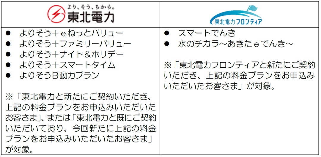なお、東北電力フロンティアでは、新たに同社の電気料金プランにご加入いただいたお客さまに、「フロンティアeポイント」(1,000ポイント)をプレゼントしており、本キャンペーンにおいても同様にプレゼントいたします。