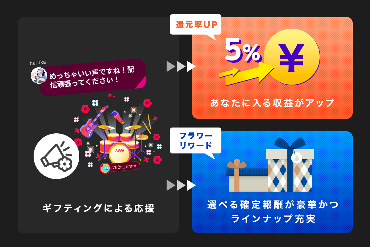 AWAラウンジでは、日頃より多くのクリエイターの方々に配信をいただいており、配信に訪れたリスナーからギフティング、コメント、スタンプなど様々な形で、クリエイターへの応援が行われています。今回、AWAはリスナーの応援がさらにクリエイターに届けばと思い、2024年6月4日0:00以降に終了したラウンジよりギフティング還元率をさらに5%引き上げることにいたしました。