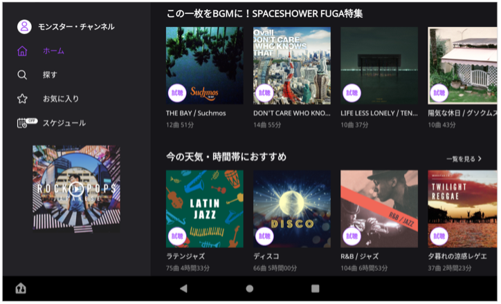 「モンスター・チャンネル」のアプリのホーム画面上に 「この1枚をBGMに! SPACE SHOWER FUGA特集」 と題したカテゴリーを設置し、週替わりでSPACE SHOWER FUGA提供のアーティスト作品をアルバム単位で展開します。