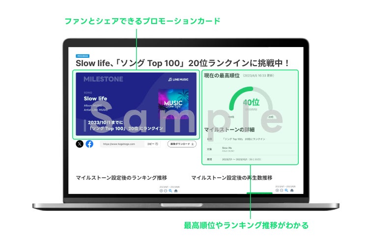 「LINE MUSIC for Artists」では、データ分析機能に加えて、LINE MUSIC上のランキング順位や、いいね数など、アーティストが叶えたい目標を掲げて、ファンと一緒に達成を目指せる「マイルストーン」機能を実装しています。「マイルストーン」機能でファンに応援を呼びかけることでファンとつながり、一緒に目標を目指すことができます。