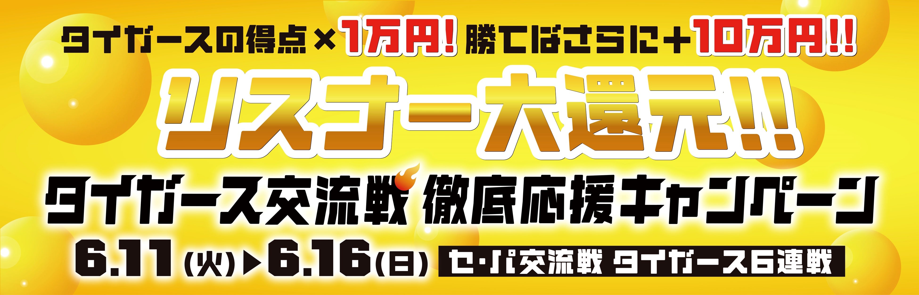 毎年大反響をいただくこの企画。5点獲ってタイガースが勝利した日には、おひとり様に15万円をドドンとプレゼント!2年前には4勝2敗、昨年のキャンペーン期間中は2勝4敗と苦戦しましたが、果たして今年はどうなるか!?